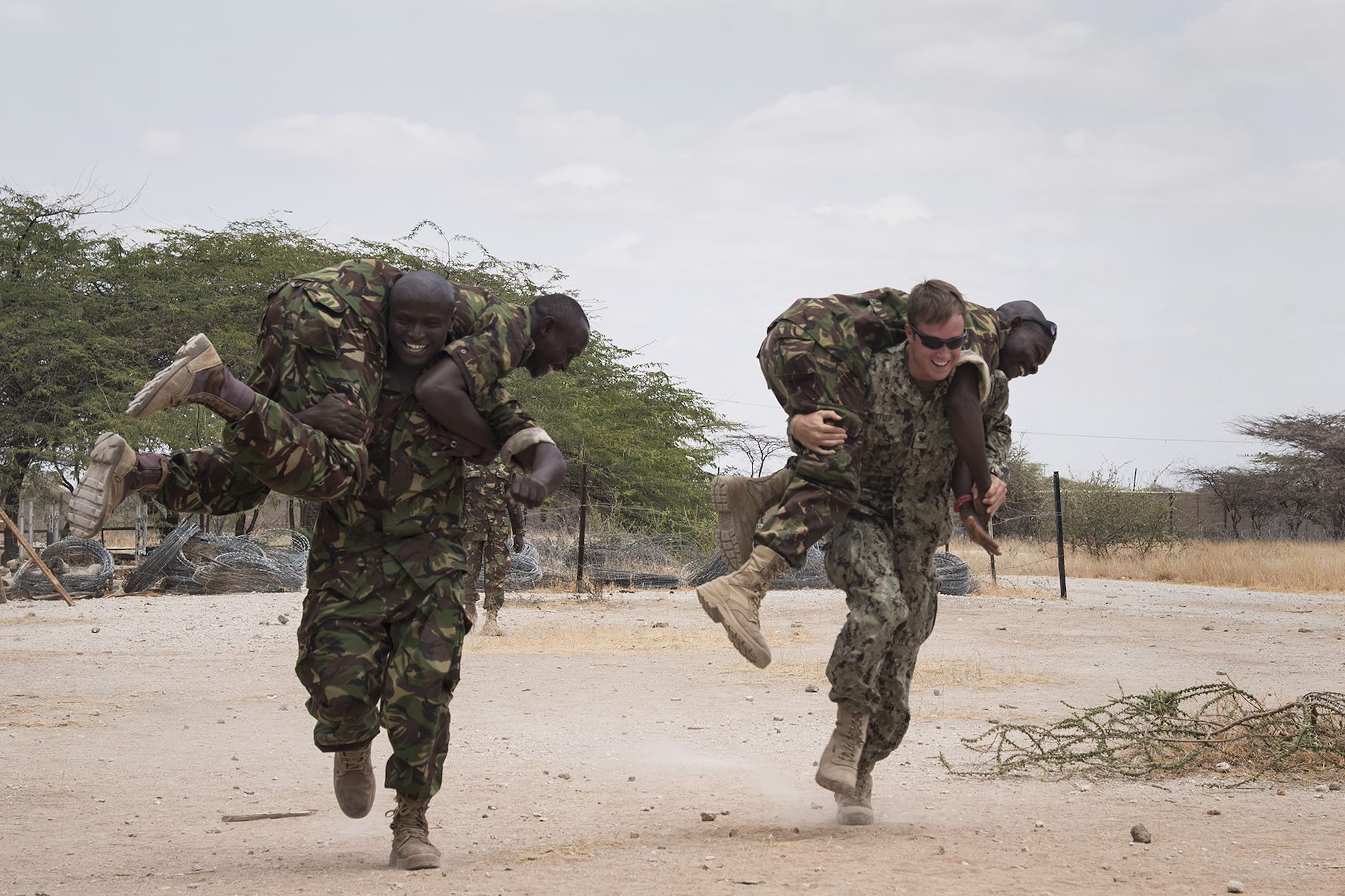 KENYA- U.S. Navy Explosive Ordnance Disposal Technician 3rd Class Nick Mettler, assigned to Task Force Sparta and currently deployed to Combined Joint Task Force-Horn of Africa, races Kenyan Defense Force combat engineers during a buddy carry lesson for the tactical combat medical training portion of Deliberate Kindle 2016, Sept. 14, at a Kenyan training facility. The medical training was just one portion of the four-week course designed to give Humanitarian Mine Action training to course attendees to prepare them for future deployments with the African Union Mission in Somalia. (U.S. Air Force photo by Staff Sgt. Tiffany DeNault)