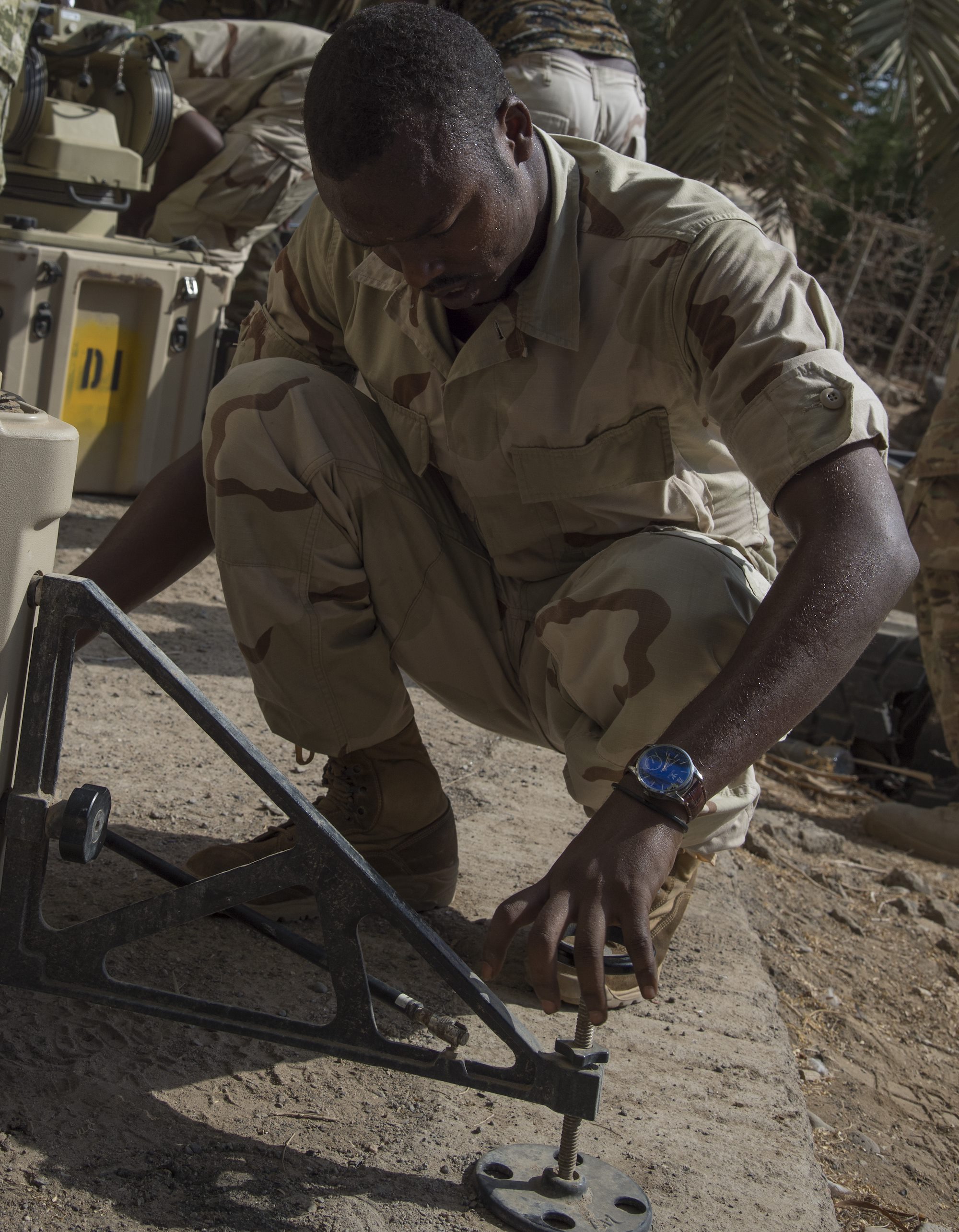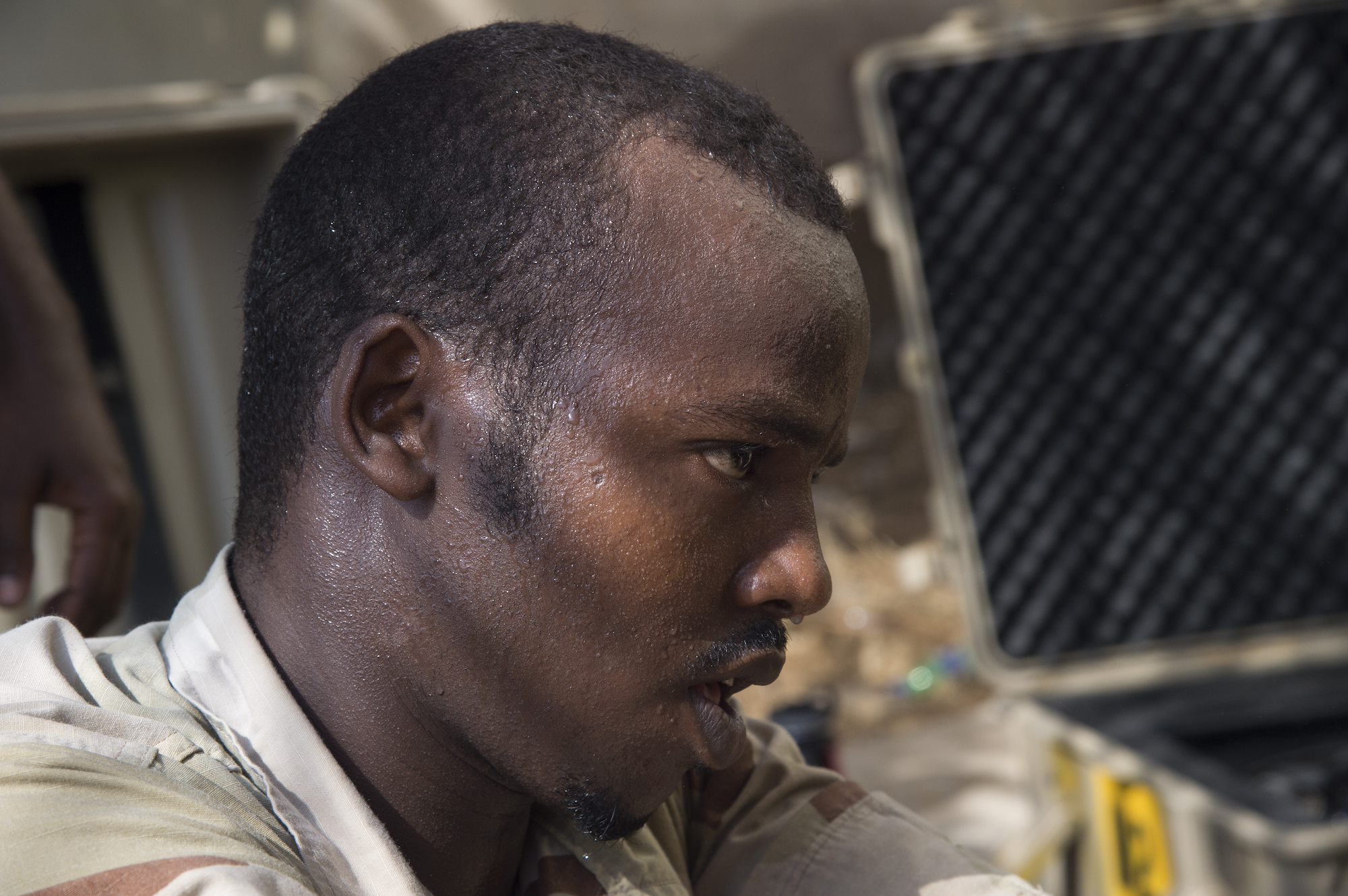 A Djibouti Armed Forces (FAD) service member sweats from the heat while setting up an Africa Data Sharing Network (ADSN) satellite Sept. 28, 2016, at FAD Headquarters in Djibouti. While conducting the best practices training, the U.S. Army, assigned to Combined Joint Task-Horn of Africa, also held an ADSN validation with the FAD soldiers to prepare them to deploy to Somalia. The ADSN provides network and Voice over Internet Protocol capabilities between the several African countries participating in Africa Union Mission in Somalia. (U.S. Air Force photo by Staff Sgt. Eric Summers Jr.)