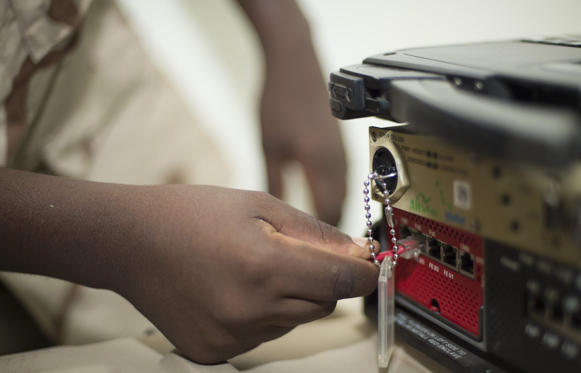 A Djibouti Armed Forces (FAD) service member connects a cord to run between an Africa Data Sharing Network (ADSN) modem and laptop Sept. 29, 2016, at FAD Headquarters in Djibouti. While conducting the best practices training, the U.S. Army, assigned to Combined Joint Task-Horn of Africa, also held an ADSN validation with the FAD soldiers to prepare them to deploy to Somalia. The ADSN provides network and Voice over Internet Protocol capabilities between the several African countries participating in Africa Union Mission in Somalia. (U.S. Air Force photo by Staff Sgt. Eric Summers Jr.)