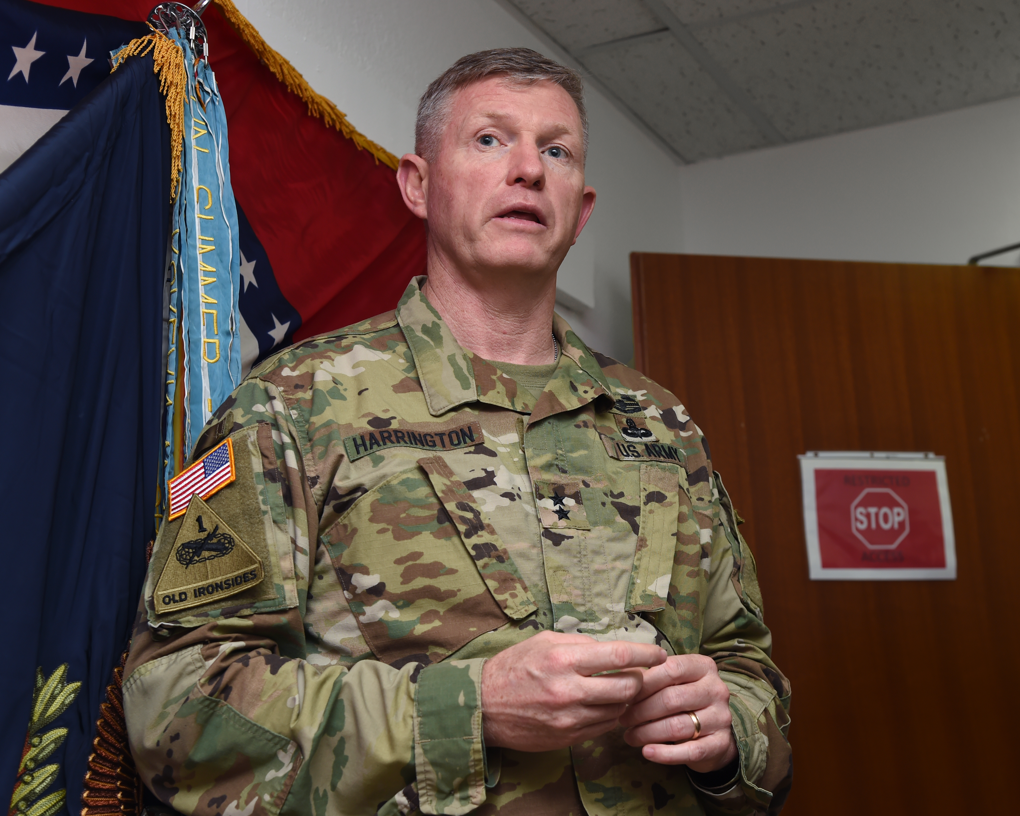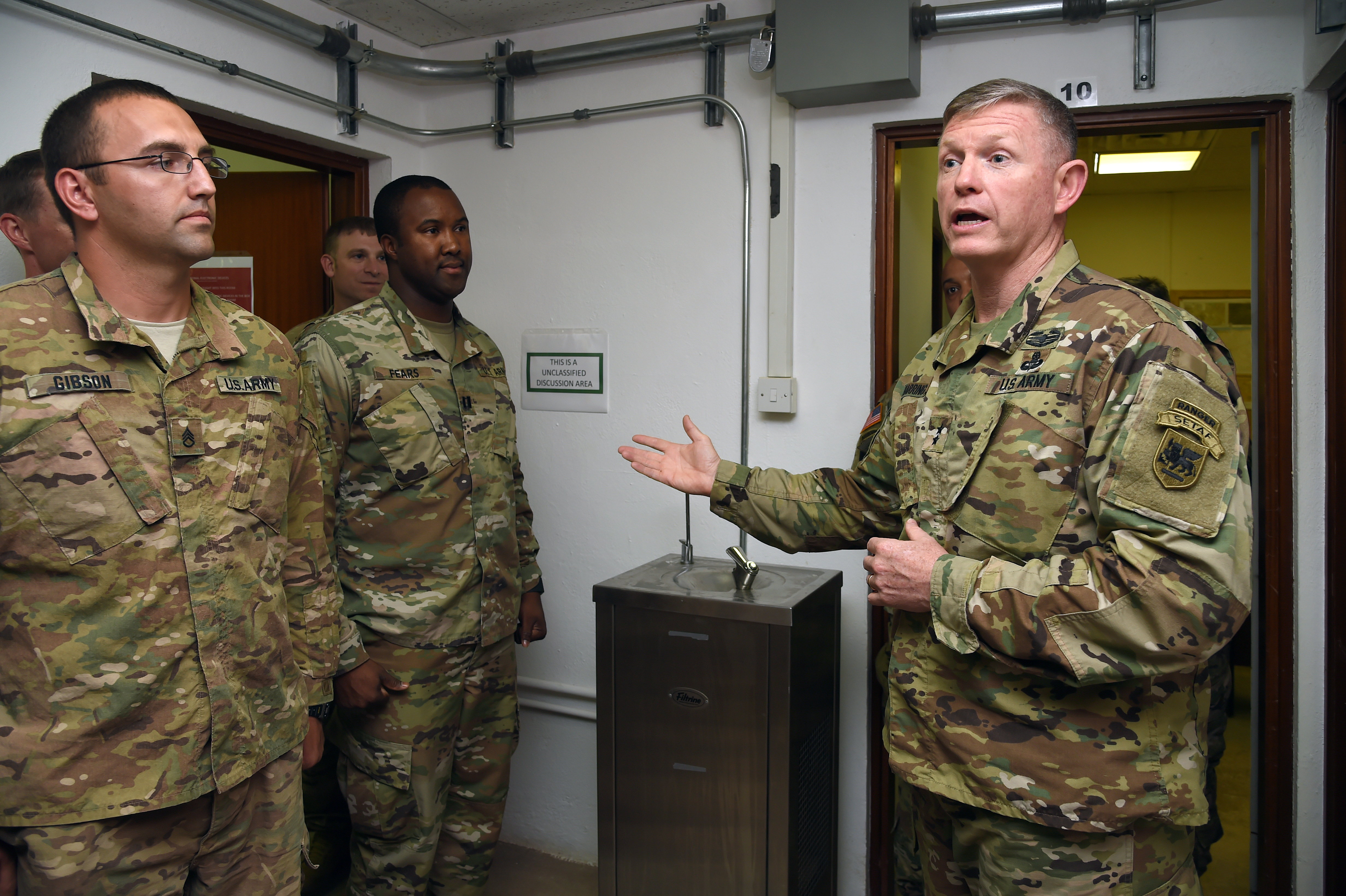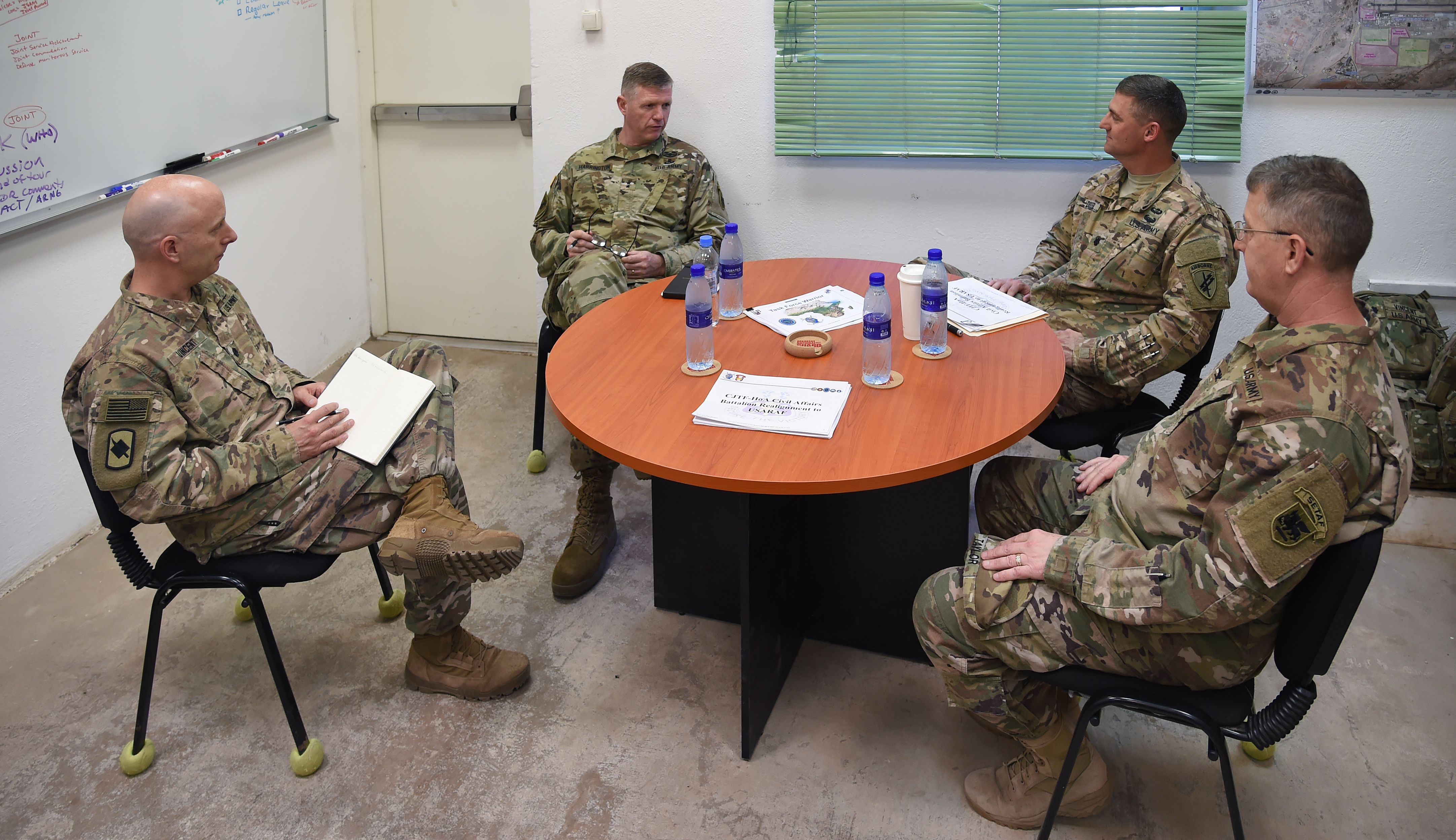 U.S. Army Maj. Gen. Joseph Harrington, commanding general of U.S. Army Africa visits with infantry and civil affairs Soldiers assigned to Combined Joint Task Force-Horn of Africa at Camp Lemonnier, Djibouti, March 22, 2017.