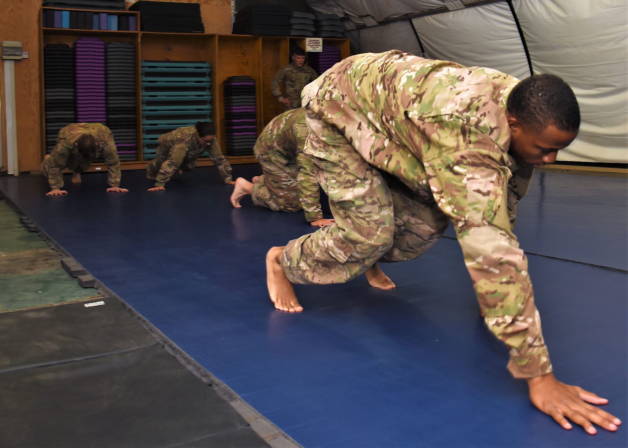 U.S. Army Spc. Rodney Drew’s body slapped down hard on the padded floor, reverberating throughout the room. Sparring with U.S. Army Pfc. Kurt Sikes, both Soldiers of the 1st Battalion, 153rd Infantry Regiment deployed with the Combined Joint Task Force – Horn of Africa (CJTF-HOA), heisted and heaved one another, alternating control with each movement.