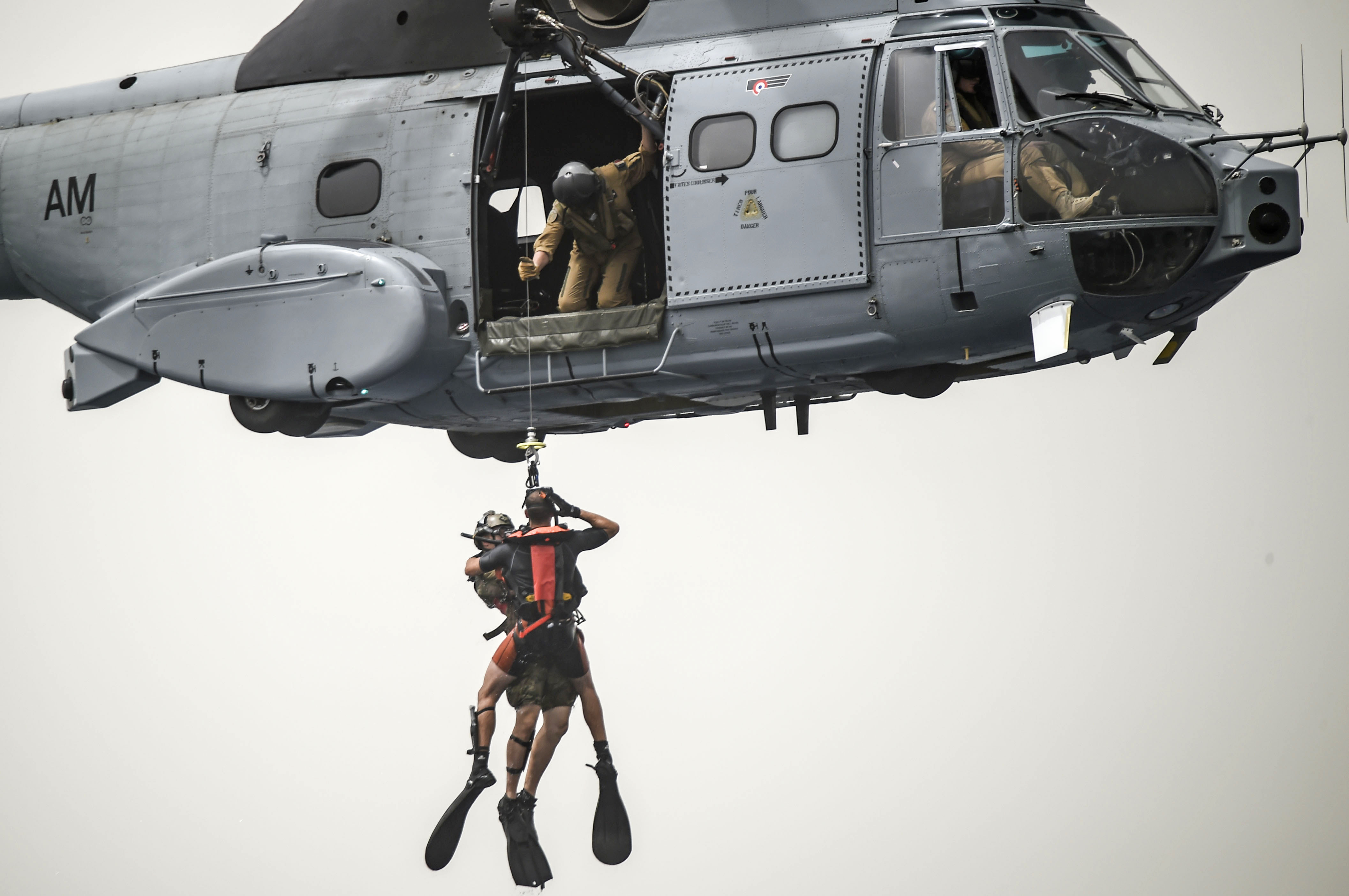 A French Air Force member assigned to the Transport Squadron ET 88 and a U.S. Air Force pararescueman from the 82nd Expeditionary Rescue Squadron, assigned to Combined Joint Task Force-Horn of Africa, are hoisted by a cable to a French Air Force Aérospatiale SA 330 Puma helicopter during a bilateral water operations exercise, in the Gulf of Tadjoura, July 3, 2017. The results of the exercise will aid in the development of standard operating procedures between CJTF-HOA and the French Forces stationed in Djibouti for the U.S. and France’s mutual support of maritime rescue capabilities within the Horn of Africa region. (U.S. Air Force photo by Staff Sgt. Eboni Prince)