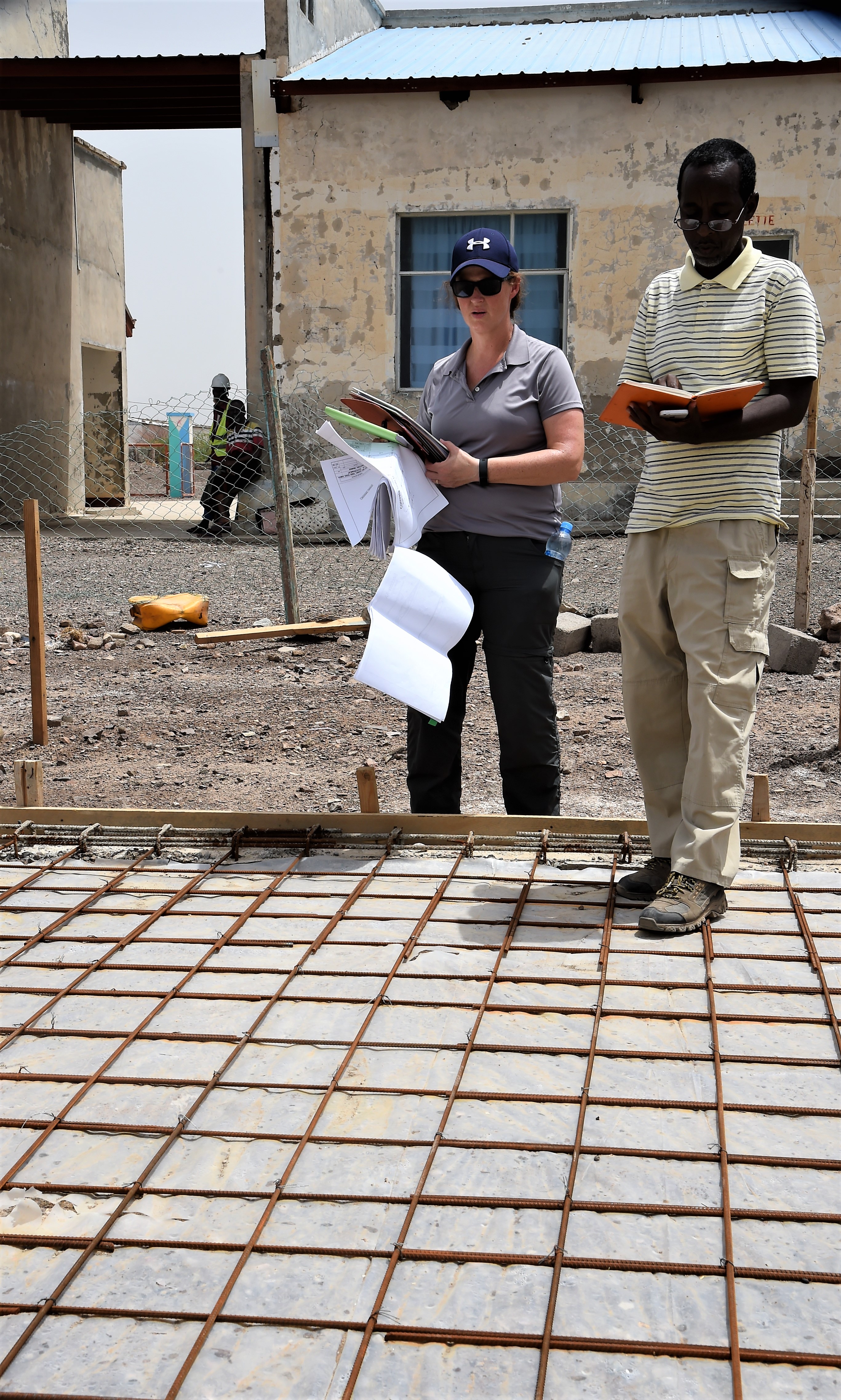 But Chavez didn’t seem to notice the elements swirling around her. Her gaze fixated on the ground, she broke her stare only to confer with a stack of plans and specifications -- she had a job to do. Chavez, a construction project manager with the CJTF-HOA Logistics Directorate, is invested in the success of this project that the Djiboutian construction team is working on.