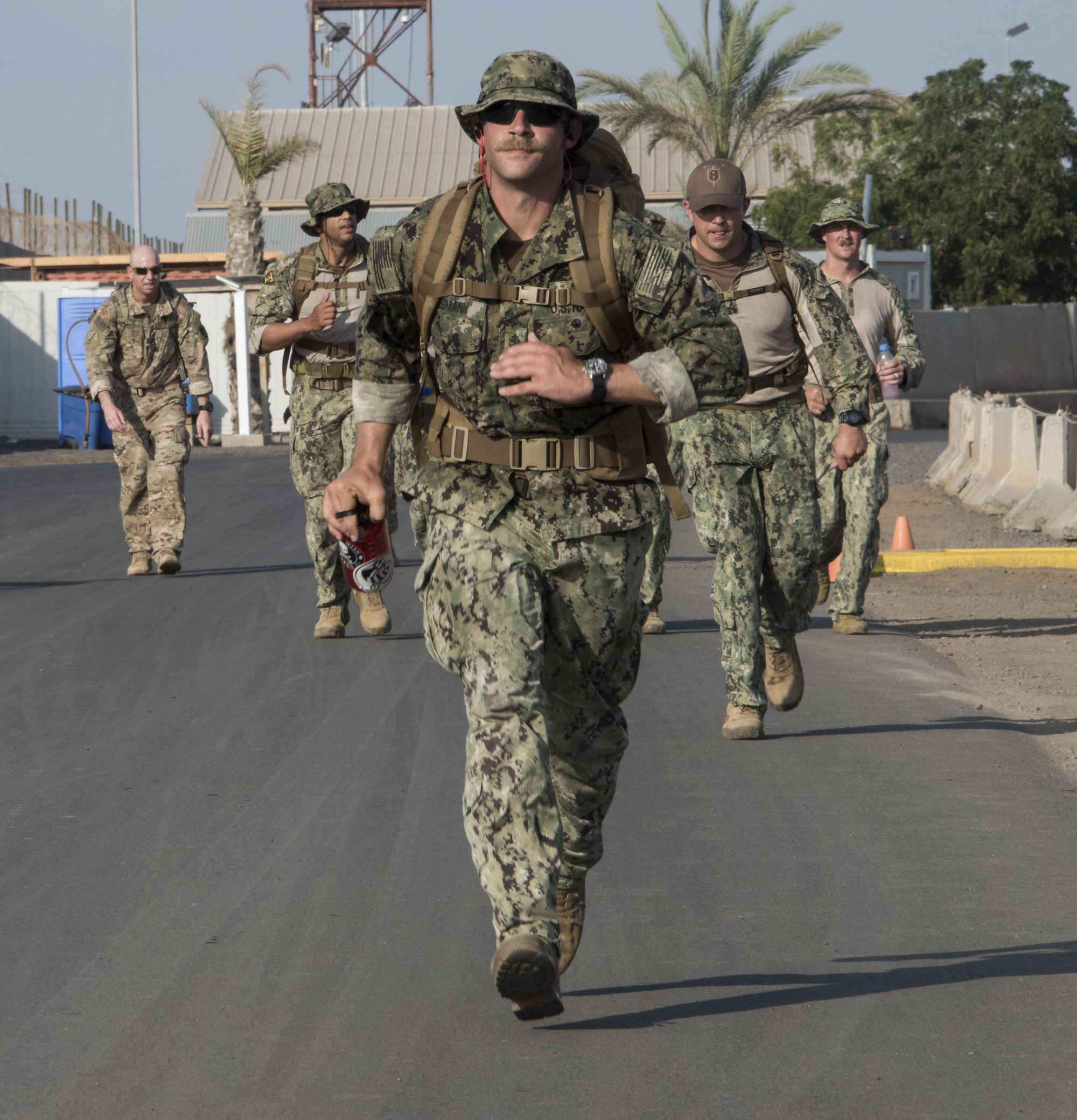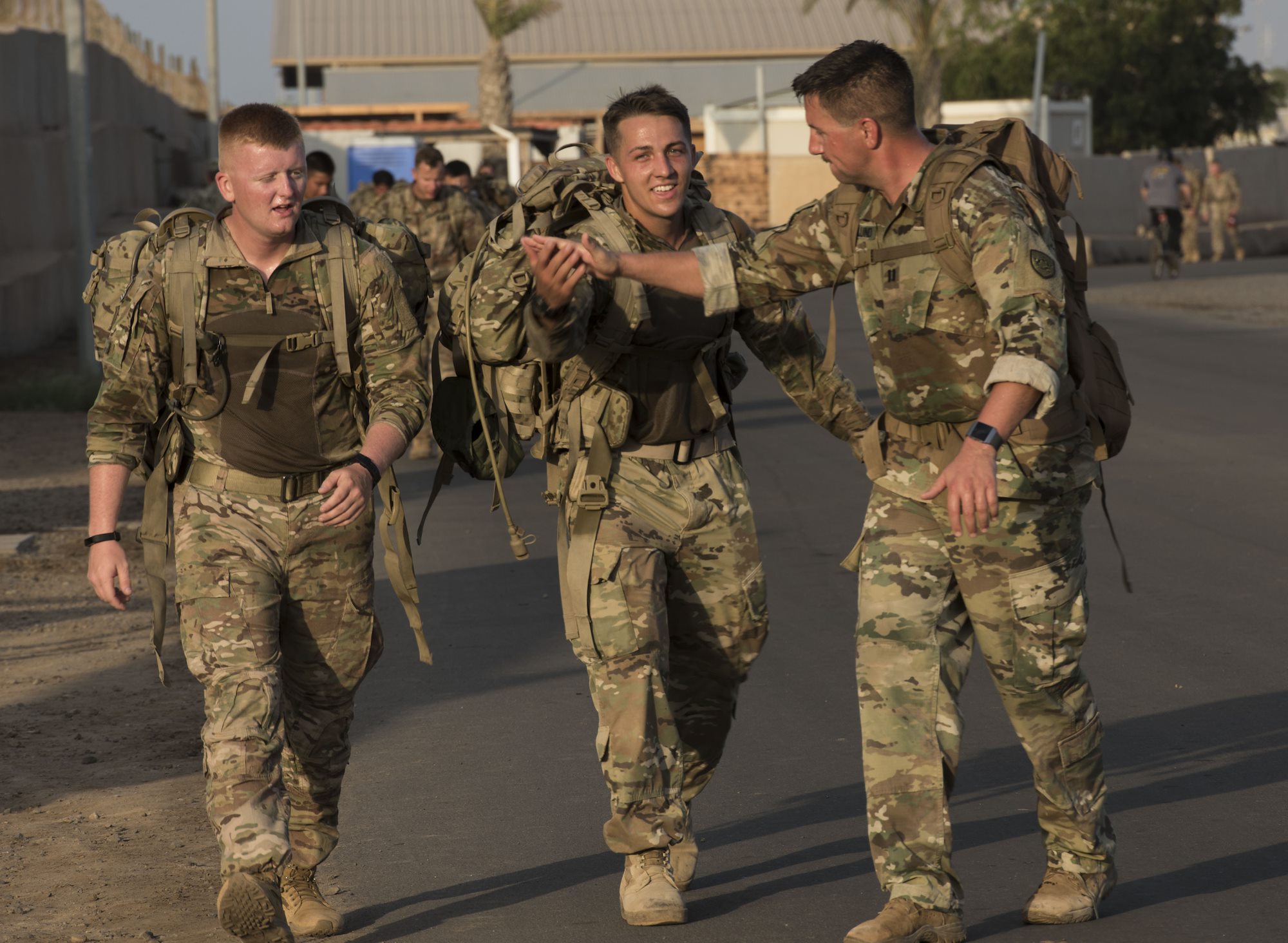 U.S. service members assigned to Combined Joint Task Force-Horn of Africa complete a ruck march as part of the competition to earn the German Armed Forces Proficiency Badge (GAFPB), a decoration of the Armed Forces of the Federal Republic of Germany, at Camp Lemonnier, Djibouti, Nov. 30, 2017. Competitors must complete a physical fitness test, uniformed swim, weapons qualification, ruck march, first aid course and chemical warfare course to be awarded the GAFPB, one of the few foreign allied military awards that U.S. service members are authorized to wear. (U.S. Air National Guard photo by Staff Sgt. Allyson L. Manners)