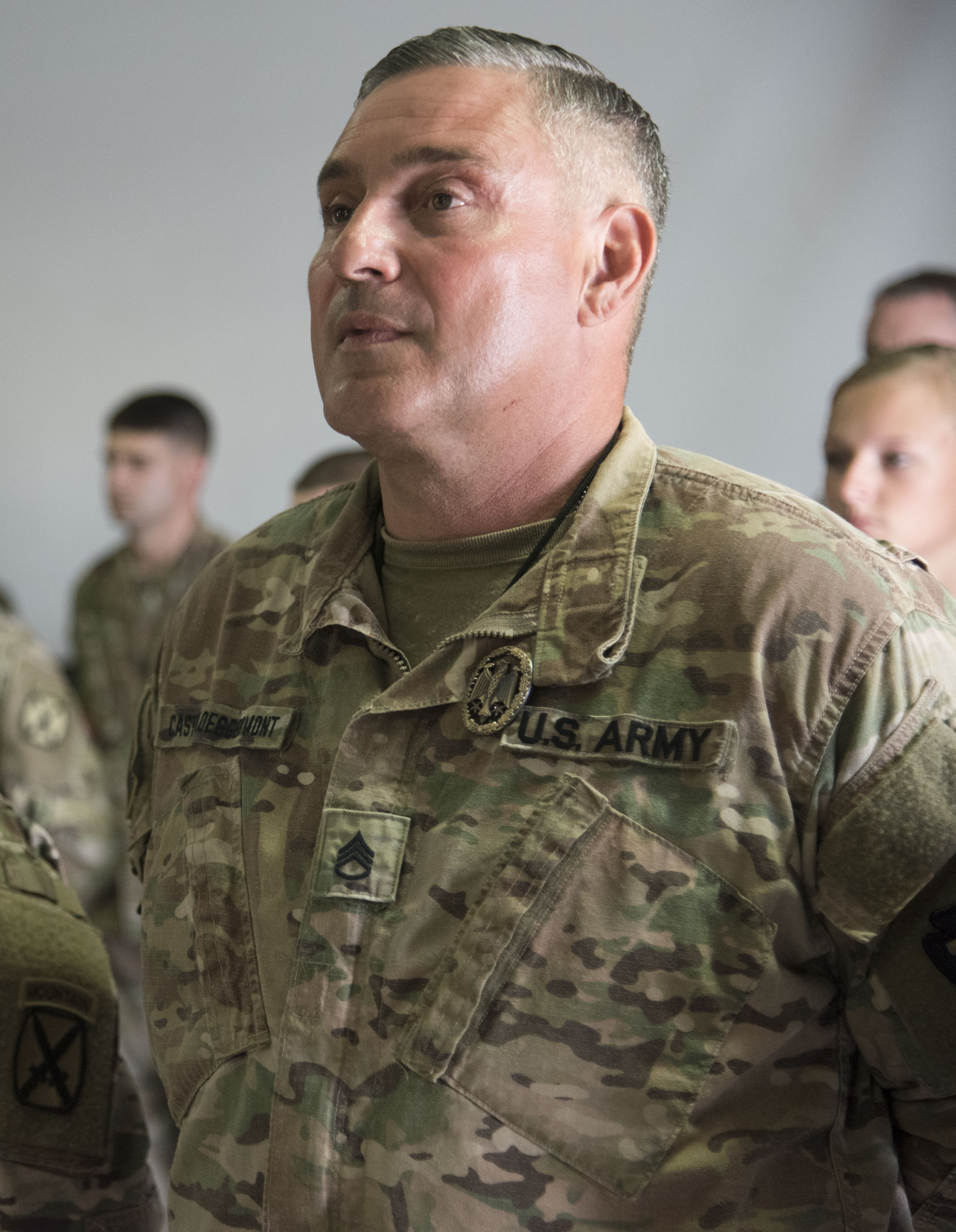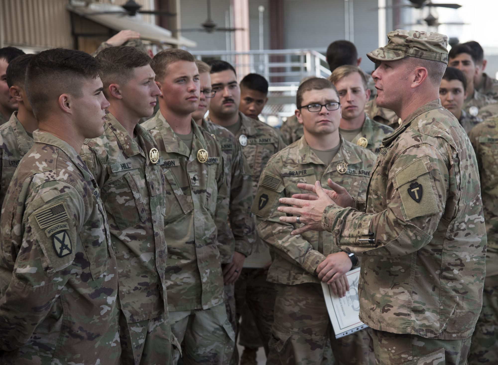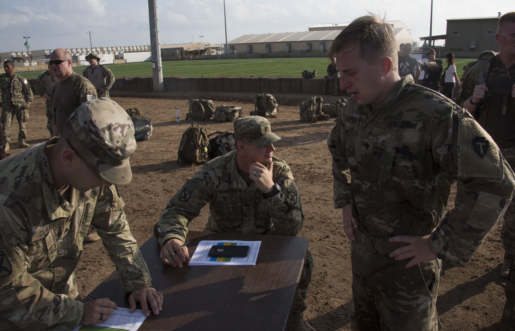 Members of the 3rd Battalion, 144th Infantry Regiment,Texas National Guard, assigned toTask Force Bayonet, Combined Joint Task Force-Horn of Africa, listen as their leadership congratulates them for earning the German Armed Forces Proficiency Badge (GAFPB) at Camp Lemonnier, Djibouti, Dec. 8, 2017. Competitors completed a physical fitness test, uniformed swim, weapons qualification, ruck march, first aid course and chemical warfare course to be awarded the GAFPB, a decoration of the Armed Forces of the Federal Republic of Germany and one of the few foreign allied military awards that U.S. service members are authorized to wear. (U.S. Air National Guard photo by Staff Sgt. Allyson L. Manners)