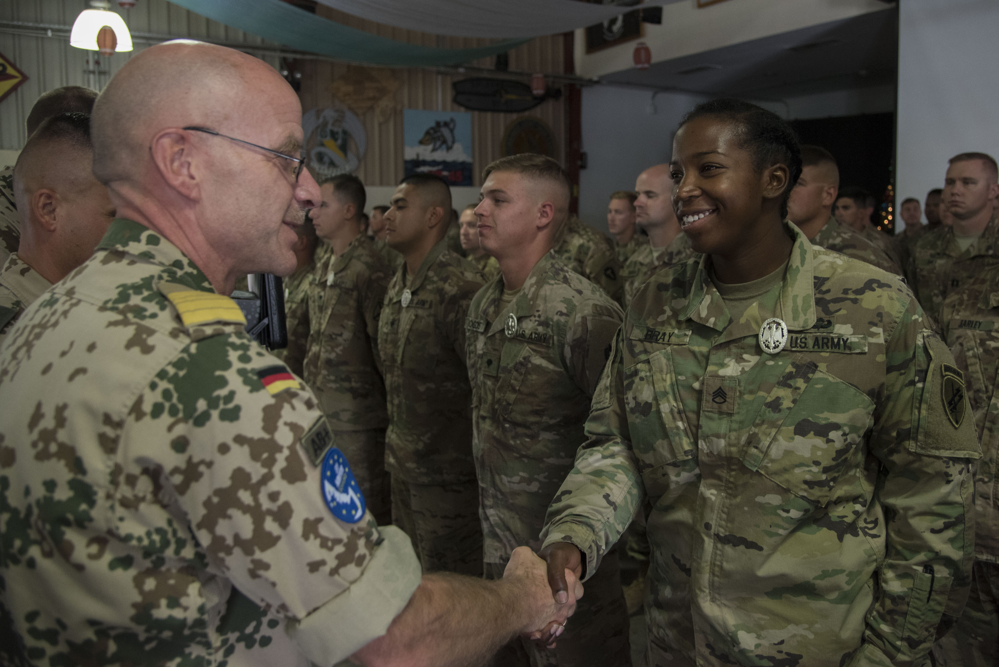 U.S. Army Staff Sgt. Sierra Bray, 346th Tactical Psychological Operations Company (Airborne), U.S. Army Reserve, Columbus, Ohio, deployed with Combined Joint Task Force-Horn of Africa, shakes hands with German commander Axel Schilling as she is awarded the German Armed Forces Proficiency Badge (GAFPB), a decoration of the Armed Forces of the Federal Republic of Germany, at Camp Lemonnier, Djibouti, Dec. 8, 2017. Competitors completed a physical fitness test, uniformed swim, weapons qualification, ruck march, first aid course and chemical warfare course to be awarded the GAFPB, one of the few foreign allied military awards that U.S. service members are authorized to wear. (U.S. Air National Guard photo by Staff Sgt. Allyson L. Manners)