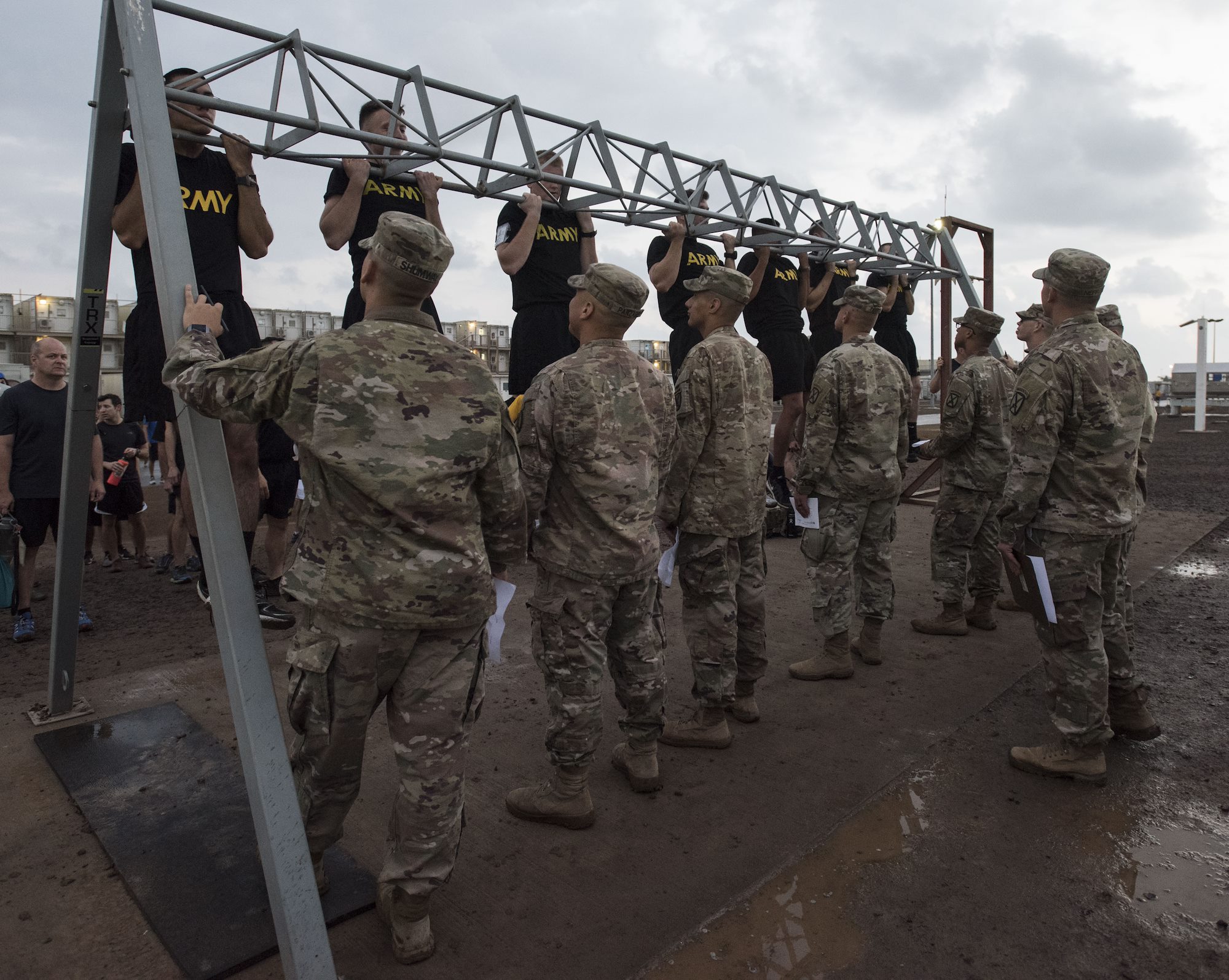 Soldiers, Sailors and Airmen from the Combined Joint Task Force – Horn of Africa (CJTF-HOA) shed sweat and tears to overcome demanding physical challenges for a chance to earn the coveted German Armed Forces Proficiency Badge (GAFPB) at Camp Lemonnier, Djibouti, Dec. 8, 2017.