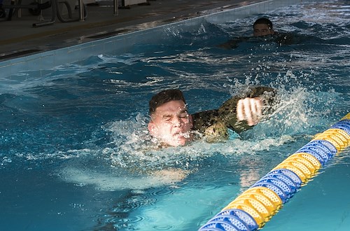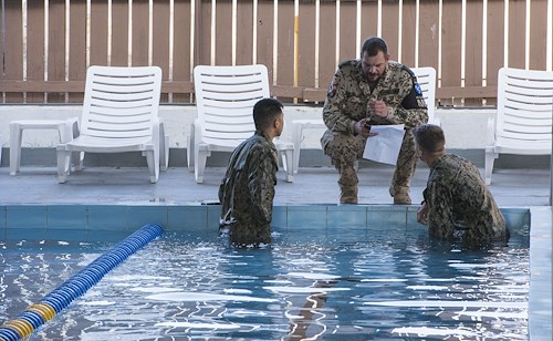 U.S. service members assigned to Combined Joint Task Force-Horn of Africa complete a swim test in uniform as part of the competition to earn the German Armed Forces Proficiency Badge (GAFPB), a decoration of the Armed Forces of the Federal Republic of Germany, at Camp Lemonnier, Djibouti, Nov 28, 2017. Competitors must complete a physical fitness test, uniformed swim, weapons qualification, ruck march, first aid course and chemical warfare course to be awarded the GAFPB, one of the few foreign allied military awards that U.S. service members are authorized to wear. (U.S. Air National Guard photo by Staff Sgt. Allyson L. Manners)