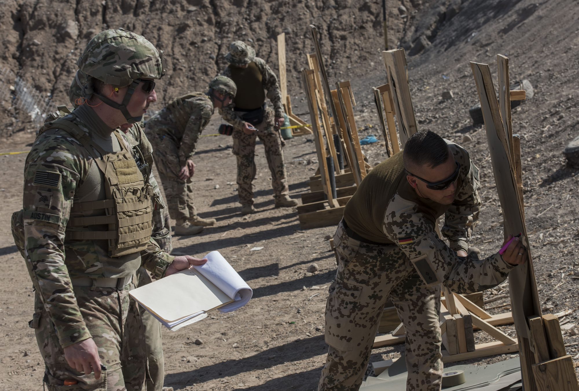 U.S. service members assigned to Combined Joint Task Force-Horn of Africa complete a weapons qualification test as part of the competition to earn the German Armed Forces Proficiency Badge (GAFPB), a decoration of the Armed Forces of the Federal Republic of Germany, at the Djiboutian National Police firing range in Djibouti City, Djibouti, Nov. 29, 2017. Competitors must complete a physical fitness test, uniformed swim, weapons qualification, ruck march, first aid course and chemical warfare course to be awarded the GAFPB, one of the few foreign allied military awards that U.S. service members are authorized to wear. (U.S. Air National Guard photo by Staff Sgt. Allyson L. Manners)