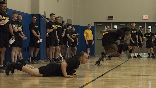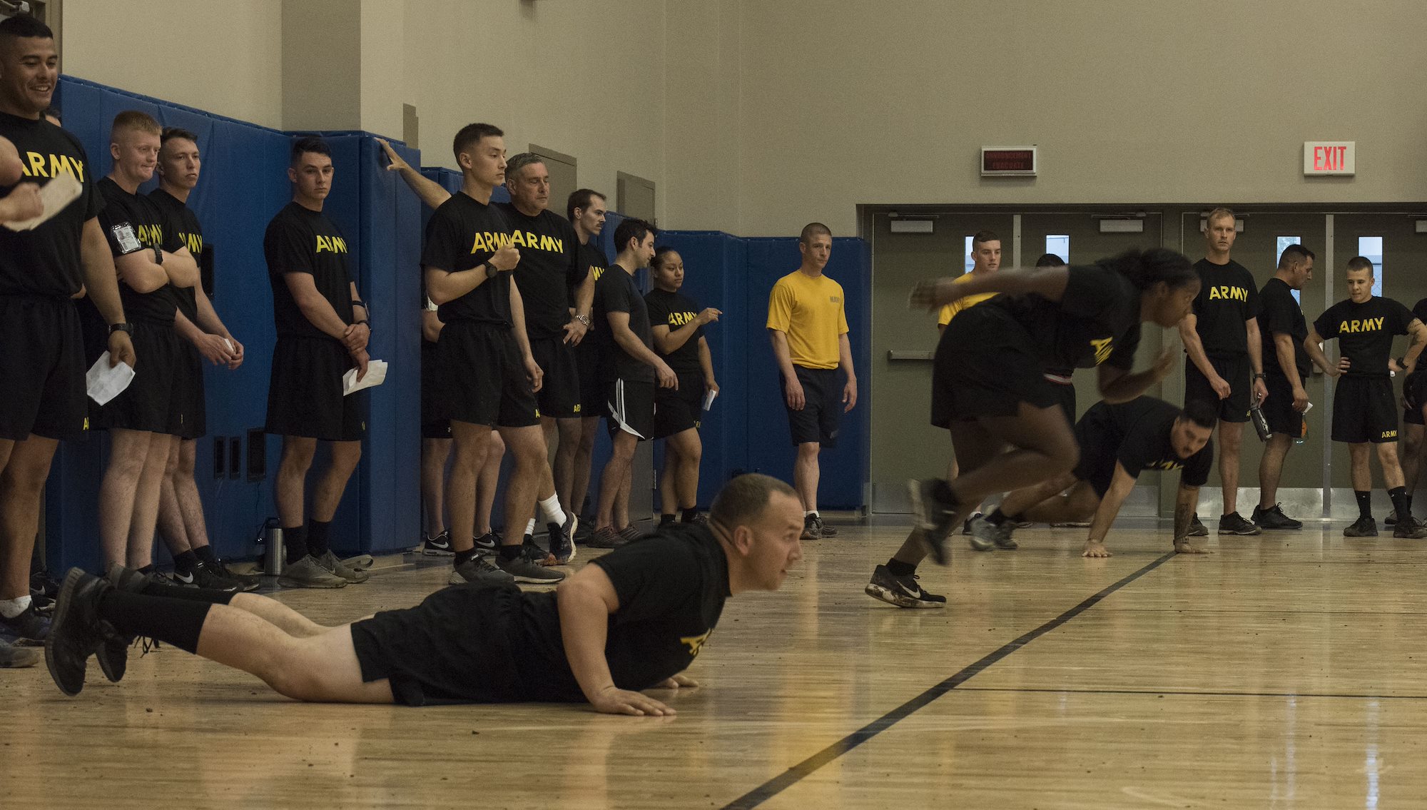 U.S. service members assigned to Combined Joint Task Force-Horn of Africa complete a physical fitness test as part of the competition to earn the German Armed Forces Proficiency Badge (GAFPB), a decoration of the Armed Forces of the Federal Republic of Germany, at Camp Lemonnier, Djibouti, Nov. 27, 2017. Competitors must complete a physical fitness test, uniformed swim, weapons qualification, ruck march, first aid course and chemical warfare course to be awarded the GAFPB, one of the few foreign allied military awards that U.S. service members are authorized to wear. (U.S. Air National Guard photo by Staff Sgt. Allyson L. Manners)