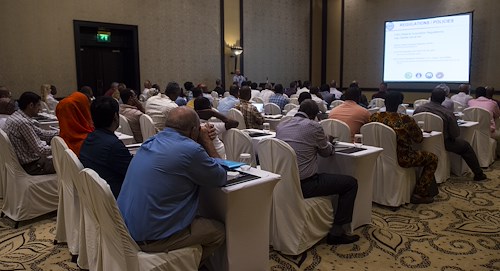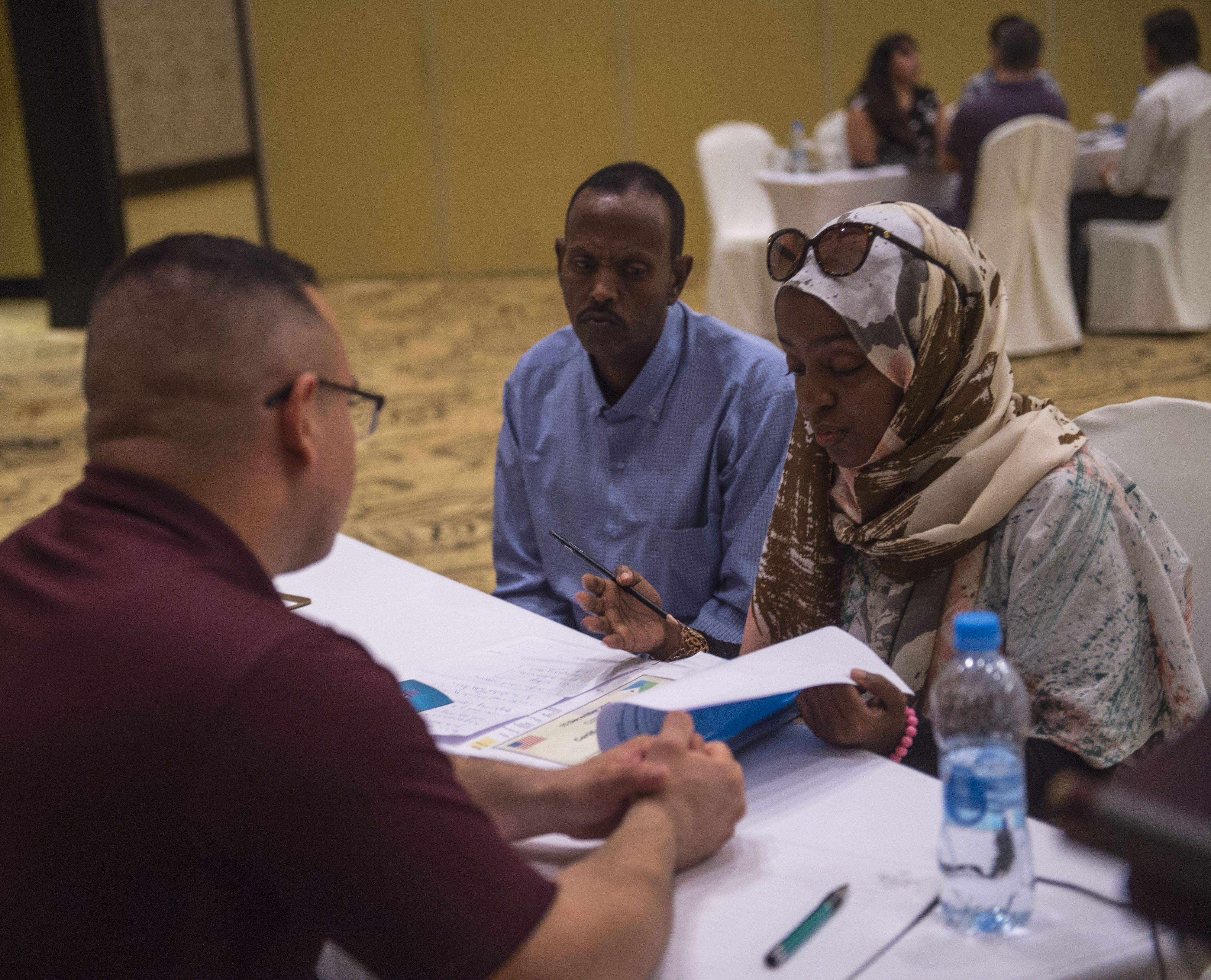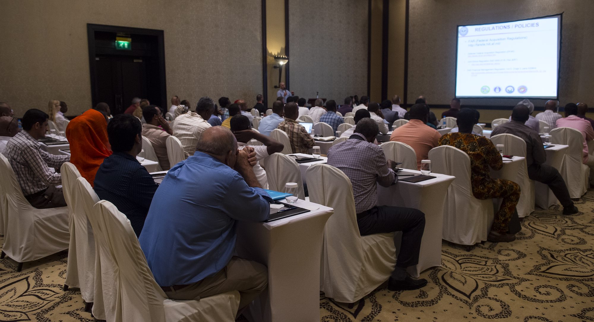 Representatives from local businesses listen to a briefing on some of the regulations and policies concerning working with the U.S. government during a Djibouti Economic Outreach Symposium held at the Kempinksi Hotel, Djibouti, Dec. 19, 2017. Hosted by the Combined Joint Task Force - Horn of Africa Contingency Contracting Office and commonly referred to as Vendor Day, the symposium is designed to bring local business owners together and inform them of the opportunities and processes of doing business as a vendor with the U.S. government. (U.S. Air Force photo by Staff Sgt. Timothy Moore)