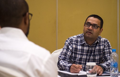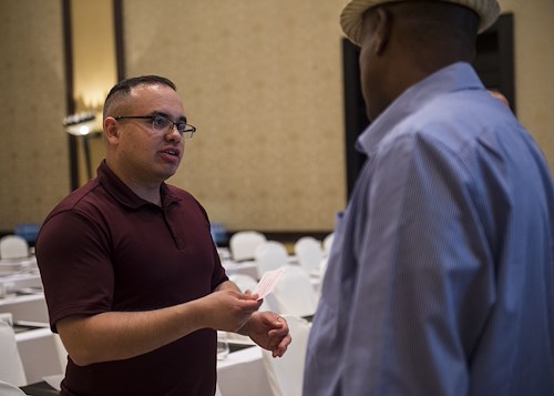 U.S. Army Staff Sgt. Uriel Ramirez, Combined Joint Task Force - Horn of Africa (CJTF-HOA) Contingency Contracting Office (CCO) contracting officer, talks with a representative from a local business during a Djibouti Economic Outreach Symposium in Ilon Du Heron, Djibouti, Dec. 19, 2017. Hosted by the CJTF-HOA CCO and commonly referred to as Vendor Day, the symposium is designed to get local business owners together and make them aware of the opportunities and process of doing business as a vendor with the U.S. government. (U.S. Air Force photo by Staff Sgt. Timothy Moore)