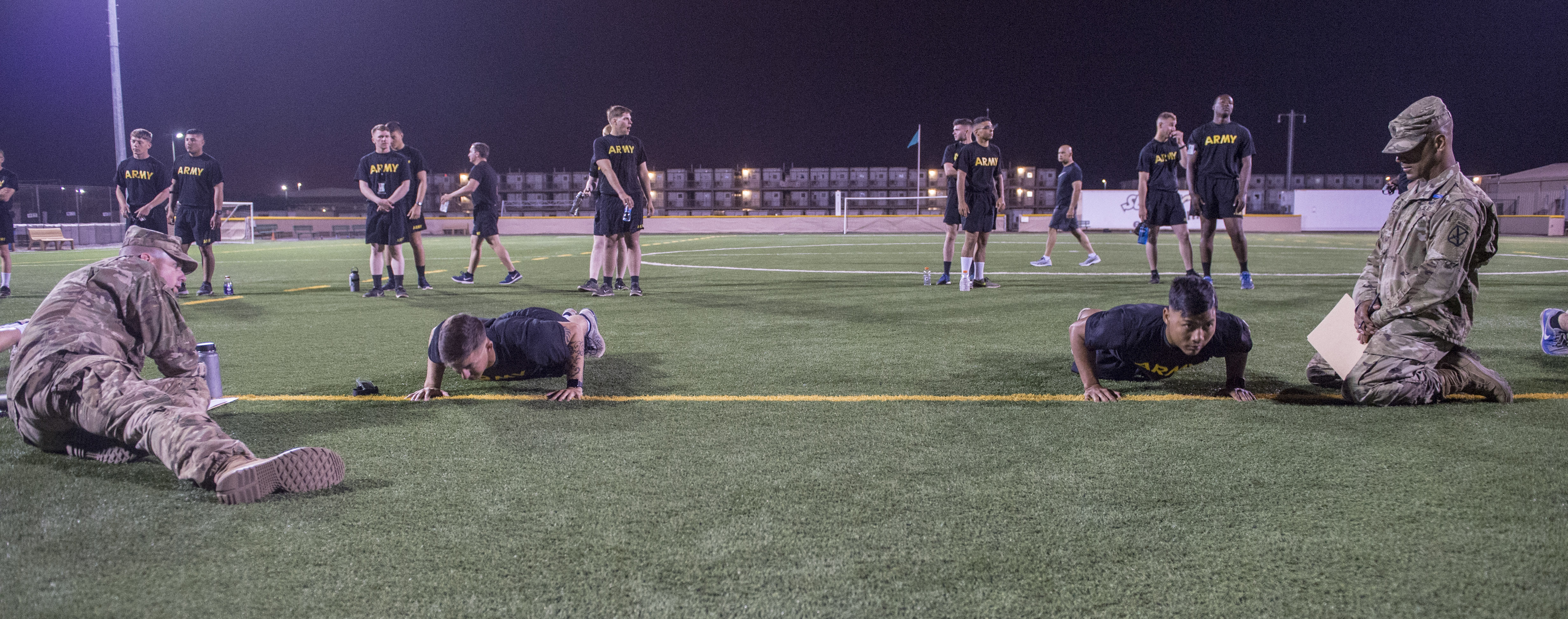 U.S. Army Soldiers assigned to Combined Joint Task Force - Horn of Africa perform pushups during the Army Physical Fitness Test portion of an Expert Infantryman Badge evaluation at Camp Lemonnier, Djibouti, Jan. 29, 2018. After two weeks of training and five days of testing, 50 Soldiers completed the process to earn the coveted special skills badge that requires Soldiers to perform an Army Physical Fitness Test, day and night land navigation, a 12-mile forced march, and 30 individual tasks covering weapons, medical, and security patrol skills. (U.S. Air Force photo by Staff Sgt. Timothy Moore)