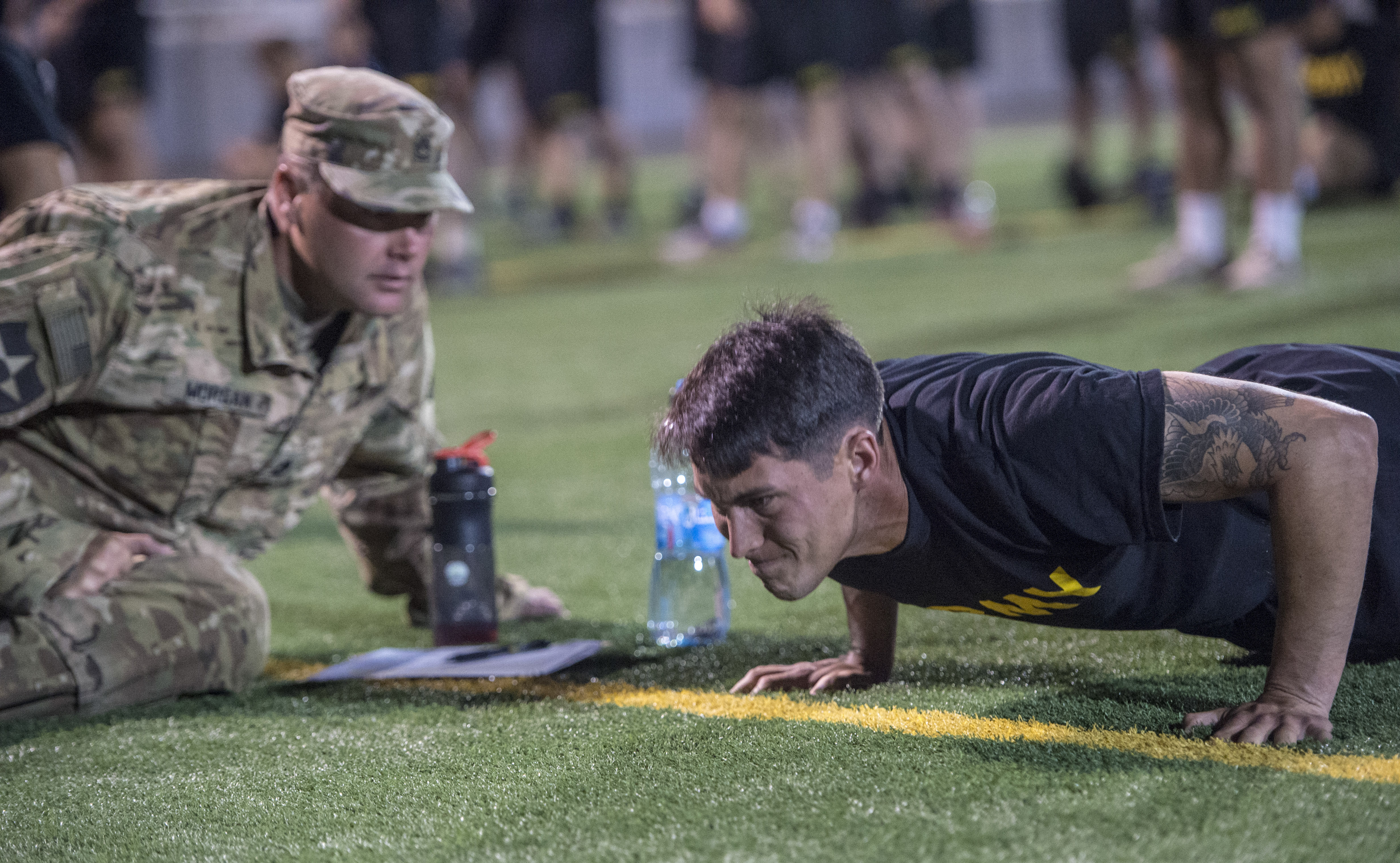 A U.S. Army Soldier assigned to Combined Joint Task Force - Horn of Africa performs a pushup during the Army Physical Fitness Test portion of an Expert Infantryman Badge evaluation at Camp Lemonnier, Djibouti, Jan. 29, 2018. After two weeks of training and five days of testing, 50 Soldiers completed the process to earn the coveted special skills badge that requires Soldiers to perform an Army Physical Fitness Test, day and night land navigation, a 12-mile forced march, and 30 individual tasks covering weapons, medical, and security patrol skills. (U.S. Air Force photo by Staff Sgt. Timothy Moore)