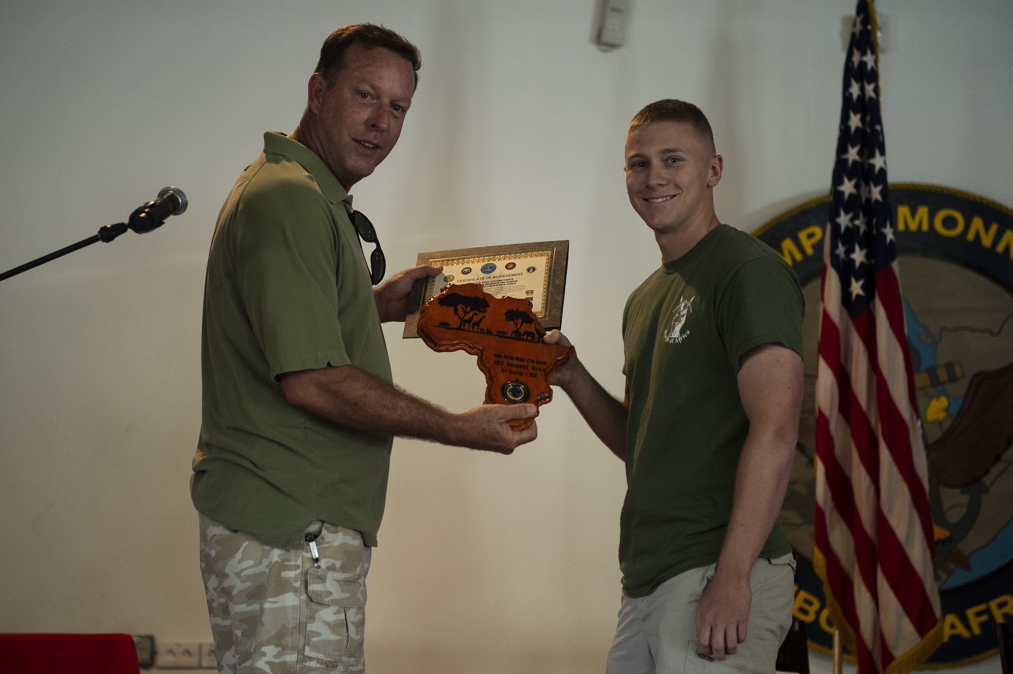 Combined Joint Task Force-Horn of Africa’s Senior Enlisted Leader, Command Master Chief Karl W. Parsons, presents a quarterly award plaque and certificate to U.S. Army Spc. Emmett M. Ryan, communications specialist for CJTF-HOA, on Camp Lemonnier, Djibouti, Oct. 20, 2018. Ryan was recognized as the CJTF-HOA Junior Service Member of the Quarter during a CJTF-HOA all-hands call. (U.S. Air Force photo by Senior Airman Scott Jackson)