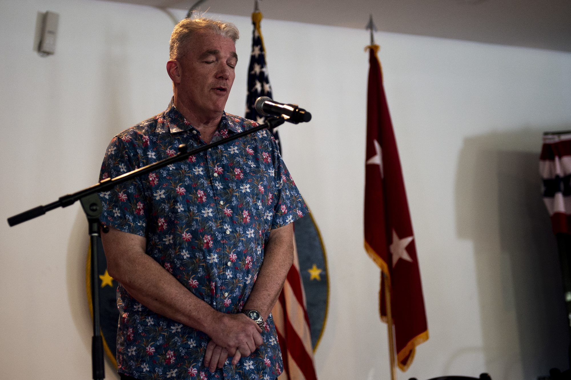U.S. Navy Capt. Robert H. Carpenter, command chaplain for Combined Joint Task Force-Horn of Africa, leads prayer before lunch during a barbecue on Camp Lemonnier, Djibouti, Oct. 20, 2018. CJTF-HOA leadershp hosted the barbecue after an award ceremony that honored CJTF-HOA’s three Service Members of the Quarter. (U.S. Air Force photo by Senior Airman Scott Jackson)