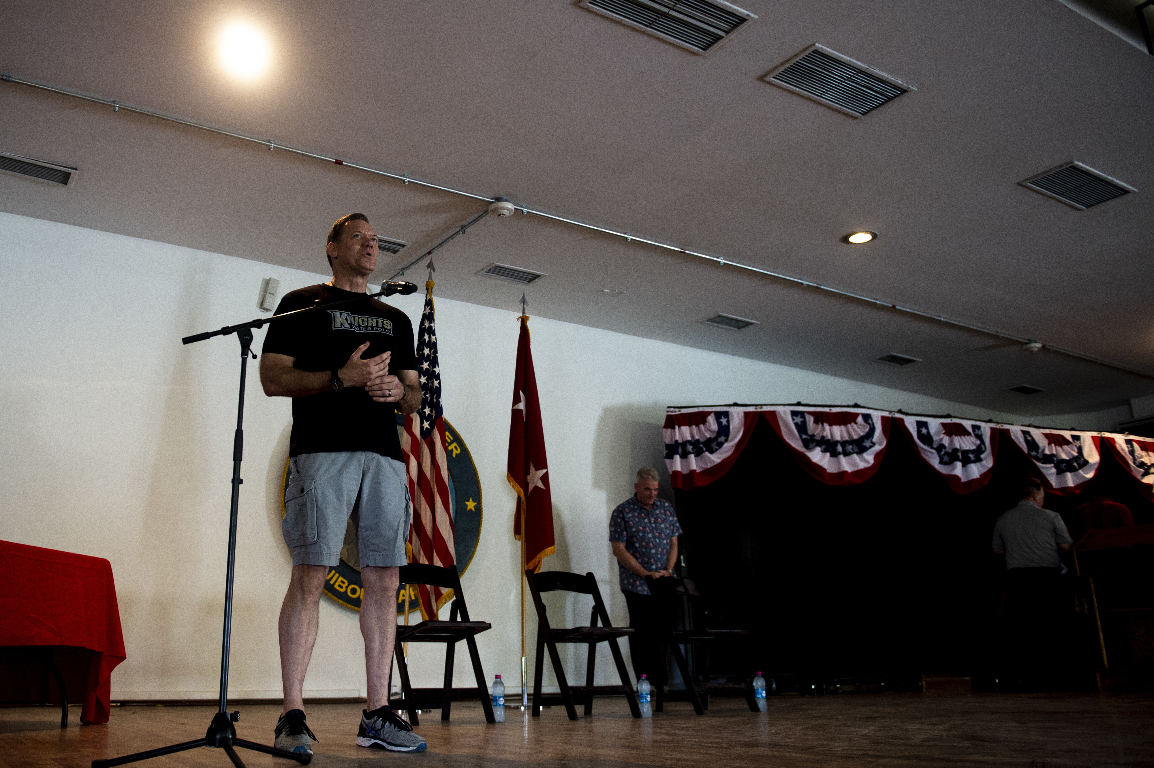 U.S. Army Maj. Gen. James D. Craig, commanding general of Combined Joint Task Force-Horn of Africa, speaks to service members during an awards ceremony on Camp Lemonnier, Djibouti, Oct. 20, 2018. Craig held an awards ceremony that recognized CJTF-HOA’s three Service Members of the Quarter. (U.S. Air Force photo by Senior Airman Scott Jackson)