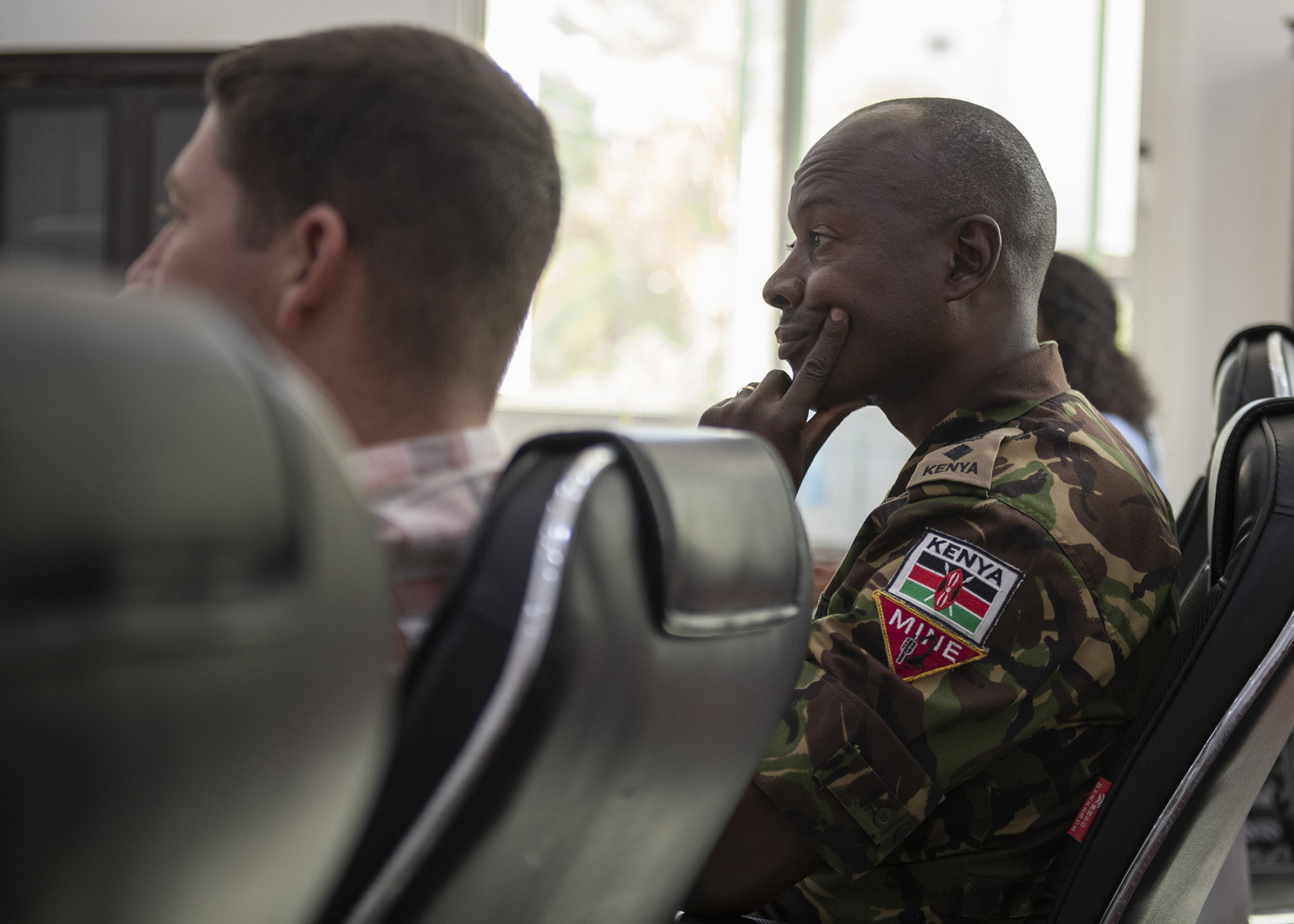 Kenya Army Lt. Col. Ndegwa Mburu, a foreign liaison officer (FLO) assigned to Combined Joint Task Force-Horn of Africa (CJTF-HOA), listens during the first-ever formal meeting between FLOs and U.S. military members assigned to CJTF-HOA, and officials from the Intergovernmental Authority on Development in Djibouti, Jan. 16, 2019. The purpose of the meeting was for both parties to familiarize themselves with each other’s missions and goals through a short information exchange and set the stance for future meetings. (U.S. Air Force photo by Tech. Sgt. Shawn Nickel)