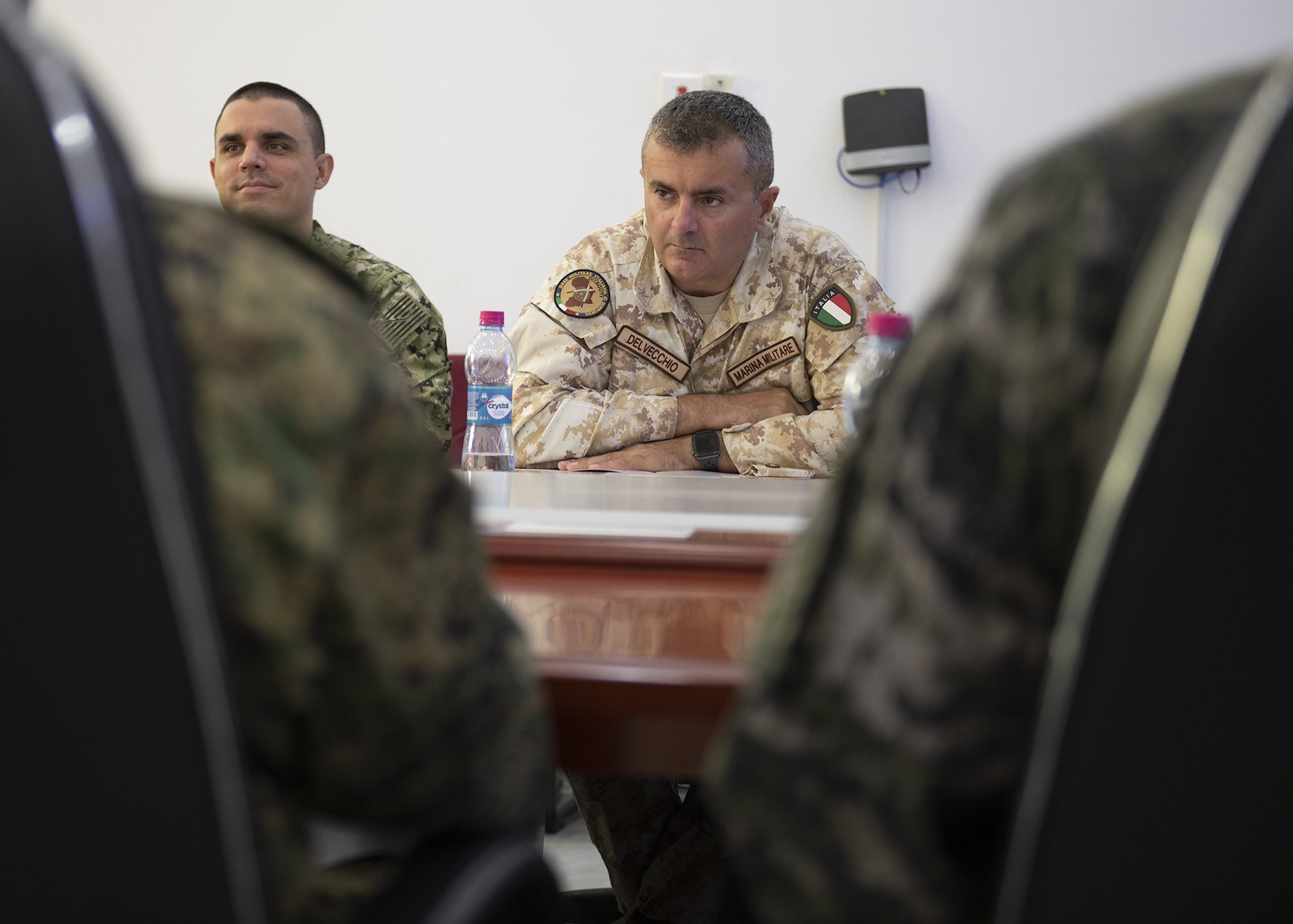 Italian Marina Militare Lt. Col. Alex Delecchio, a foreign liaison officer (FLO) assigned to Combined Joint Task Force-Horn of Africa (CJTF-HOA), listens during the first-ever formal meeting between FLOs and U.S. military members assigned to CJTF-HOA, and officials from the Intergovernmental Authority on Development in Djibouti, Jan. 16, 2019. The purpose of the meeting was for both parties to familiarize themselves with each other’s missions and goals through a short information exchange and set the stance for future meetings. (U.S. Air Force photo by Tech. Sgt. Shawn Nickel)
