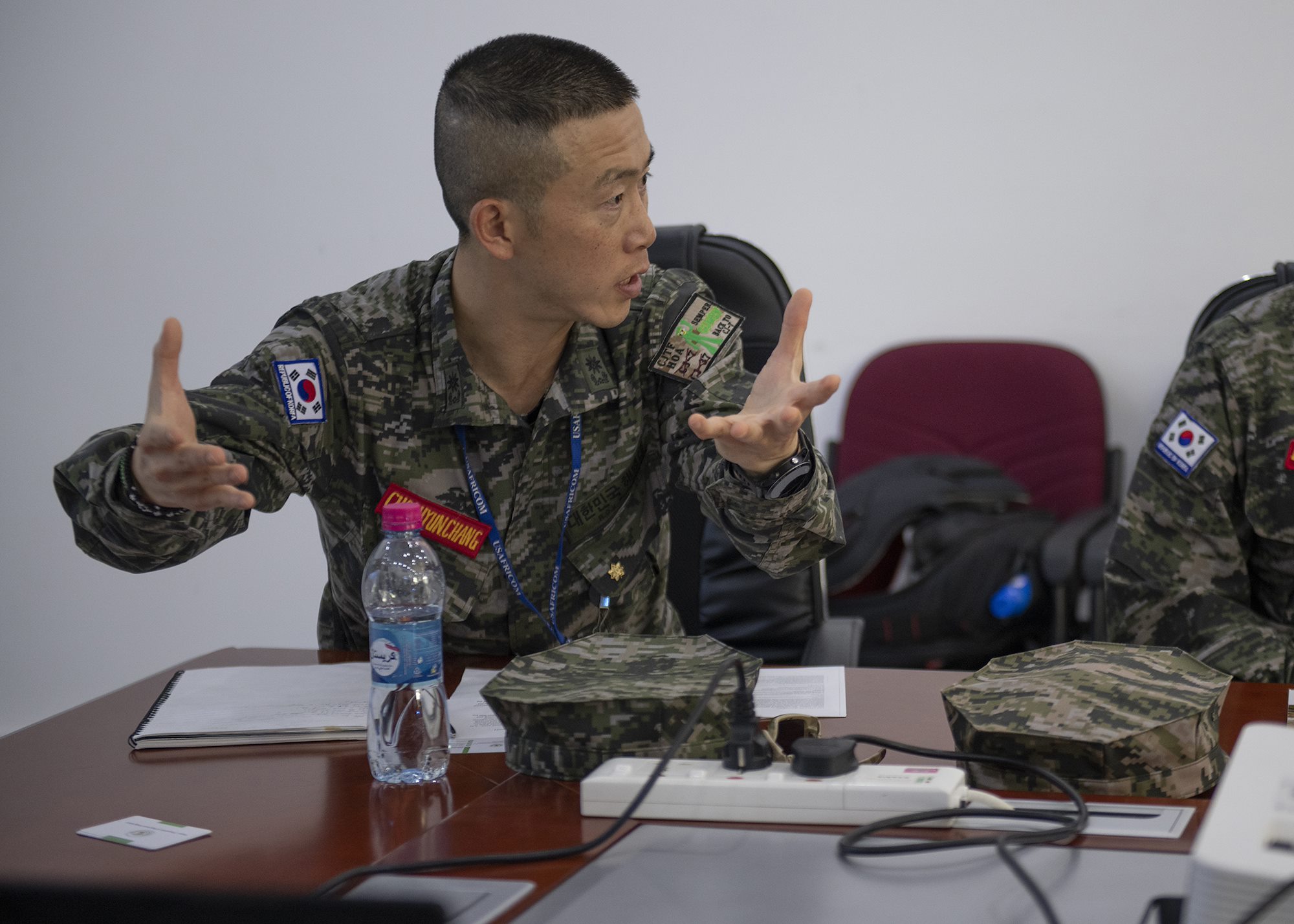 Republic of Korea Marine Maj. Hyunchang Choi, a foreign liaison officer (FLO) assigned to Combined Joint Task Force-Horn of Africa (CJTF-HOA), starts a discussion during the first-ever formal meeting between FLOs and U.S. military members assigned to CJTF-HOA, and officials from the Intergovernmental Authority on Development in Djibouti, Jan. 16, 2019. The purpose of the meeting was for both parties to familiarize themselves with each other’s missions and goals through a short information exchange and set the stance for future meetings. (U.S. Air Force photo by Tech. Sgt. Shawn Nickel)