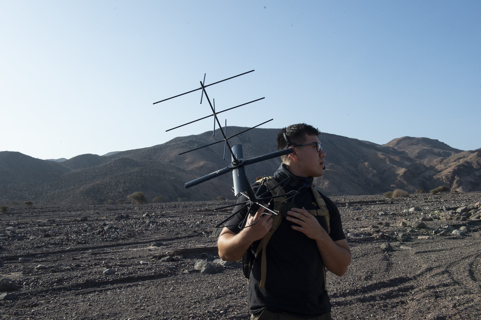 U.S. Marine Corps Cpl. Kyle Sherwood, a tactical communications operator assigned to Combined Joint Task Force-Horn of Africa, adjusts a radio antenna at the top of a peak during an exercise at the Arta Range Complex, Djibouti, Jan. 18, 2019. A joint team of Soldiers, Sailors and Marines utilized the exercise to test all forms of radio equipment they could be tasked to use in case of a last-minute forward deployment. (U.S. Air Force photo by Tech. Sgt. Shawn Nickel)