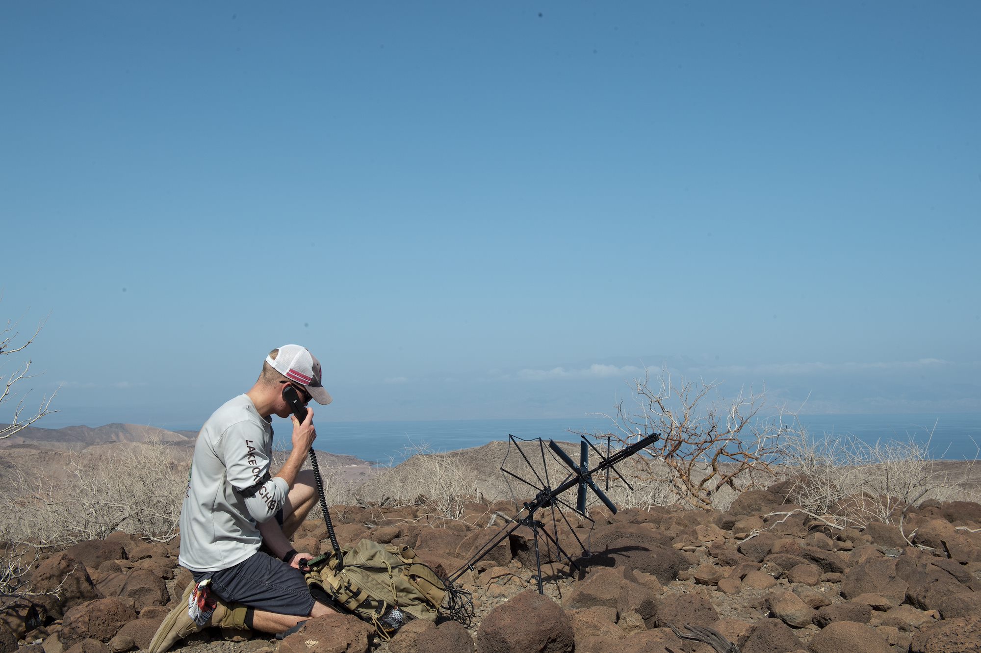 U.S. Marine Corps Cpl. Kyle Sherwood, a tactical communications operator assigned to Combined Joint Task Force-Horn of Africa, sends a radio transmission from the top of a peak during an exercise at the Arta Range Complex, Djibouti, Jan. 18, 2019. A joint team of Soldiers, Sailors and Marines utilized the exercise to test all forms of radio equipment they could be tasked to use in case of a last-minute forward deployment. (U.S. Air Force photo by Tech. Sgt. Shawn Nickel)