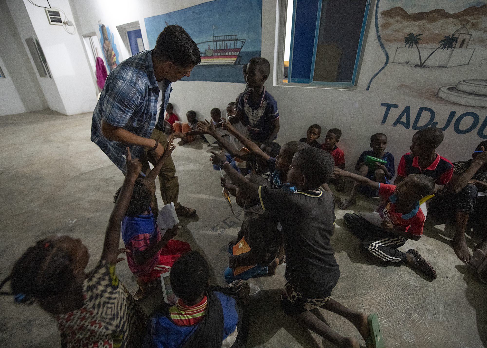U.S. Army Staff Sgt. Brian Zimmerman, an operations NCO from the 403rd Civil Affairs Battalion, assigned to Combined Joint Task Force-Horn of Africa, works with children during an English Discussion Group in Tadjourah, Djibouti, Feb. 12, 2019. More than 90 Djiboutian youth and adults attended the group where students develop practical linguistic and rhetorical skills through conversation with English-speaking U.S. service members. (U.S. Air Force photo by Tech. Sgt. Shawn Nickel)