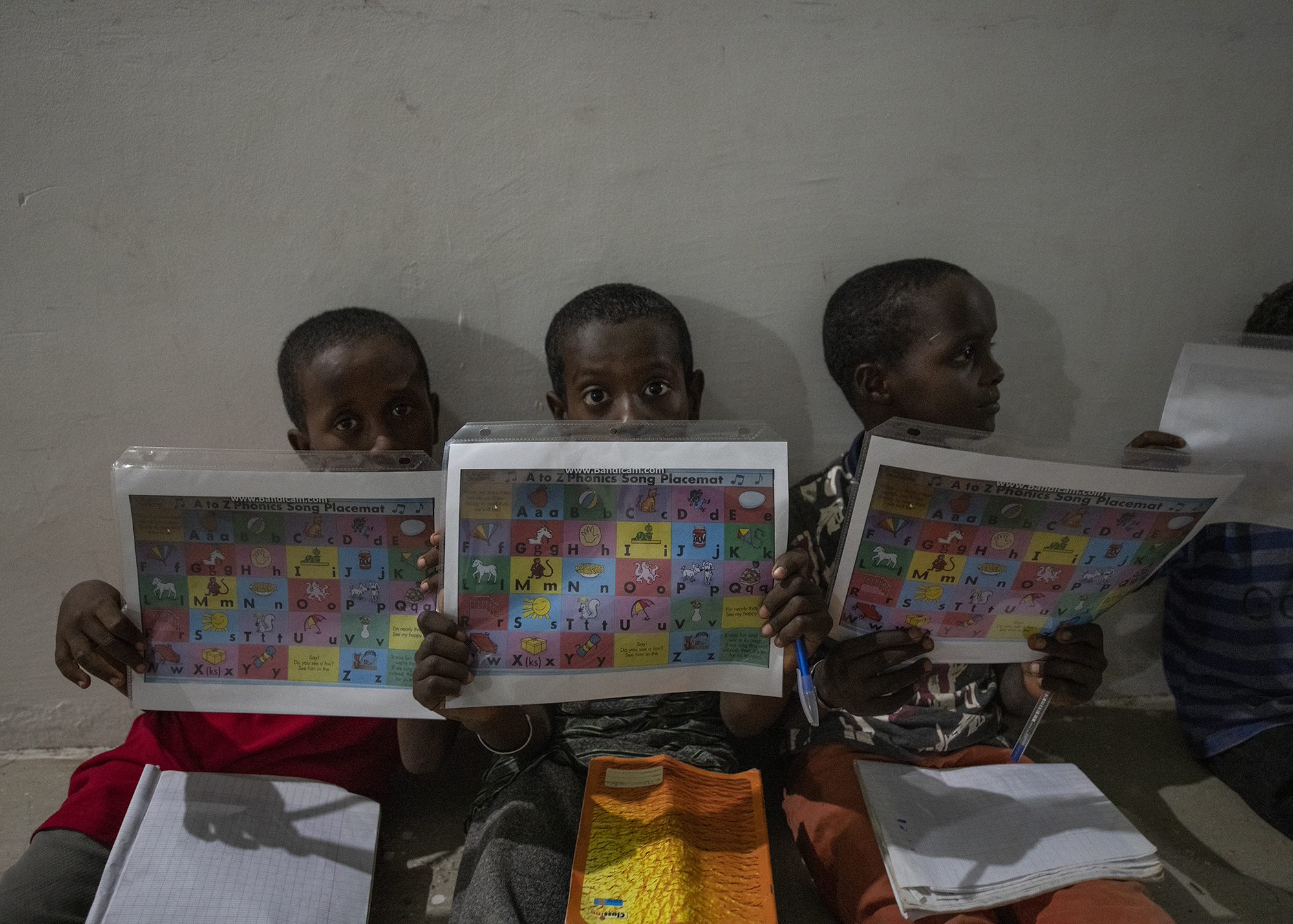 Children use reading aids during an English Discussion Group led by U.S. Army Soldiers from Bravo Company, 404th Civil Affairs Battalion, assigned to Combined Joint Task Force-Horn of Africa, in Tadjourah, Djibouti, Feb. 12, 2019. More than 90 Djiboutian youth and adults attended the group where students develop practical linguistic and rhetorical skills through conversation with English-speaking U.S. service members. (U.S. Air Force photo by Tech. Sgt. Shawn Nickel)