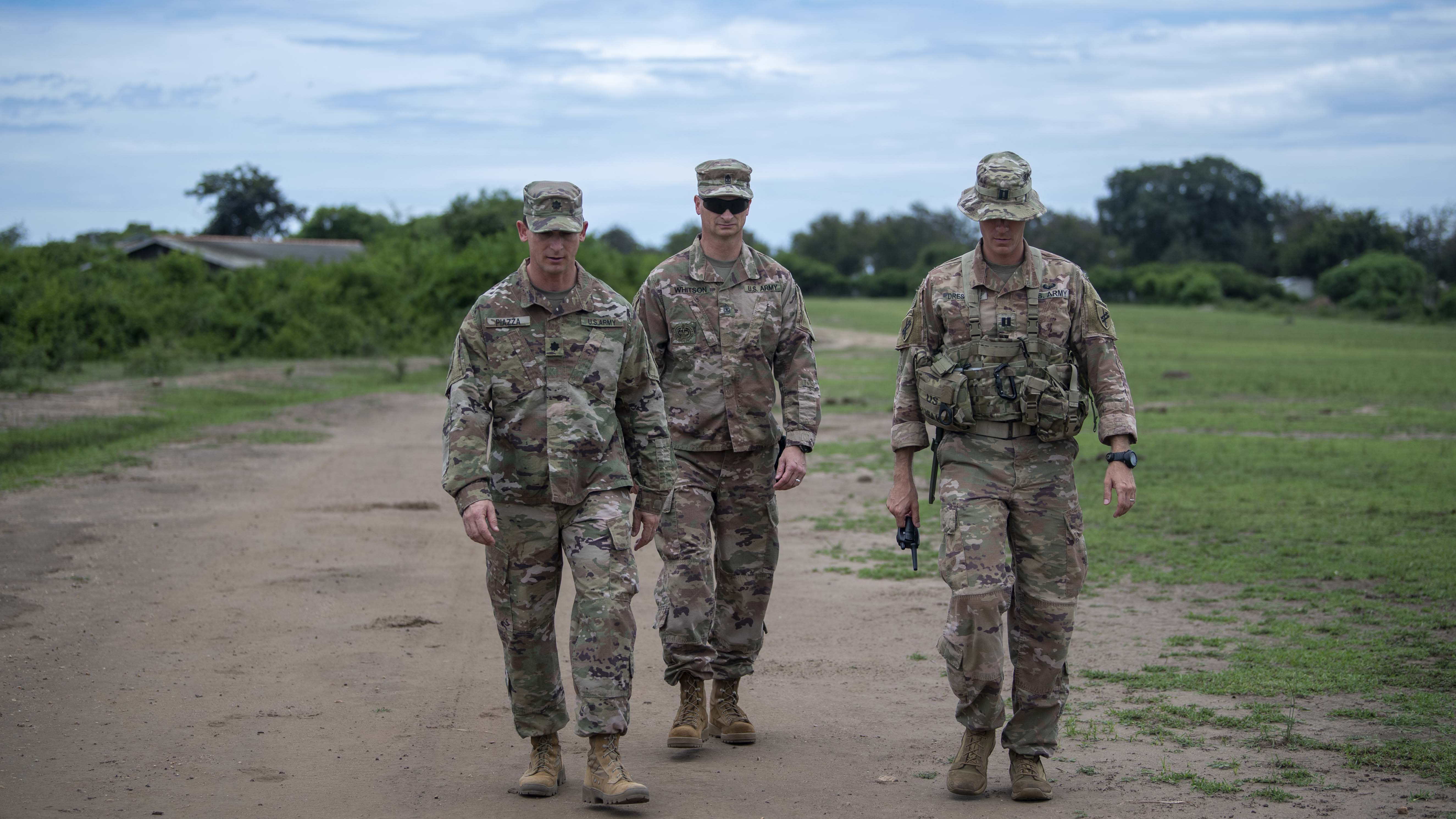 U.S. Army Capt. John Dreskler escorts U.S. Army Lt. Col. Cecil Piazza, commander 411th Civil Affairs Battalion (CABN); and U.S. Army Command Sgt. Maj. Ryan Whitson through the different training lanes for a Counter Illicit Trafficking Junior Leadership Course at Queen Elizabeth Park, Uganda, Oct. 10, 2019. Twenty-five UWA Rangers graduated the course. (U.S. Air Force photo by Staff Sgt. J.D. Strong II)
