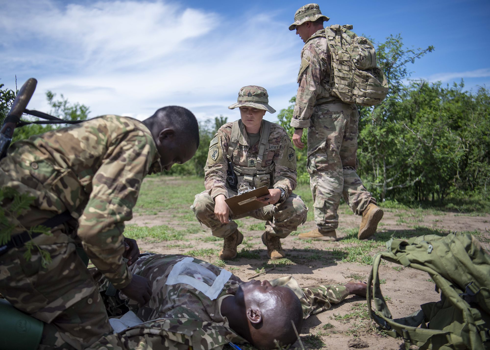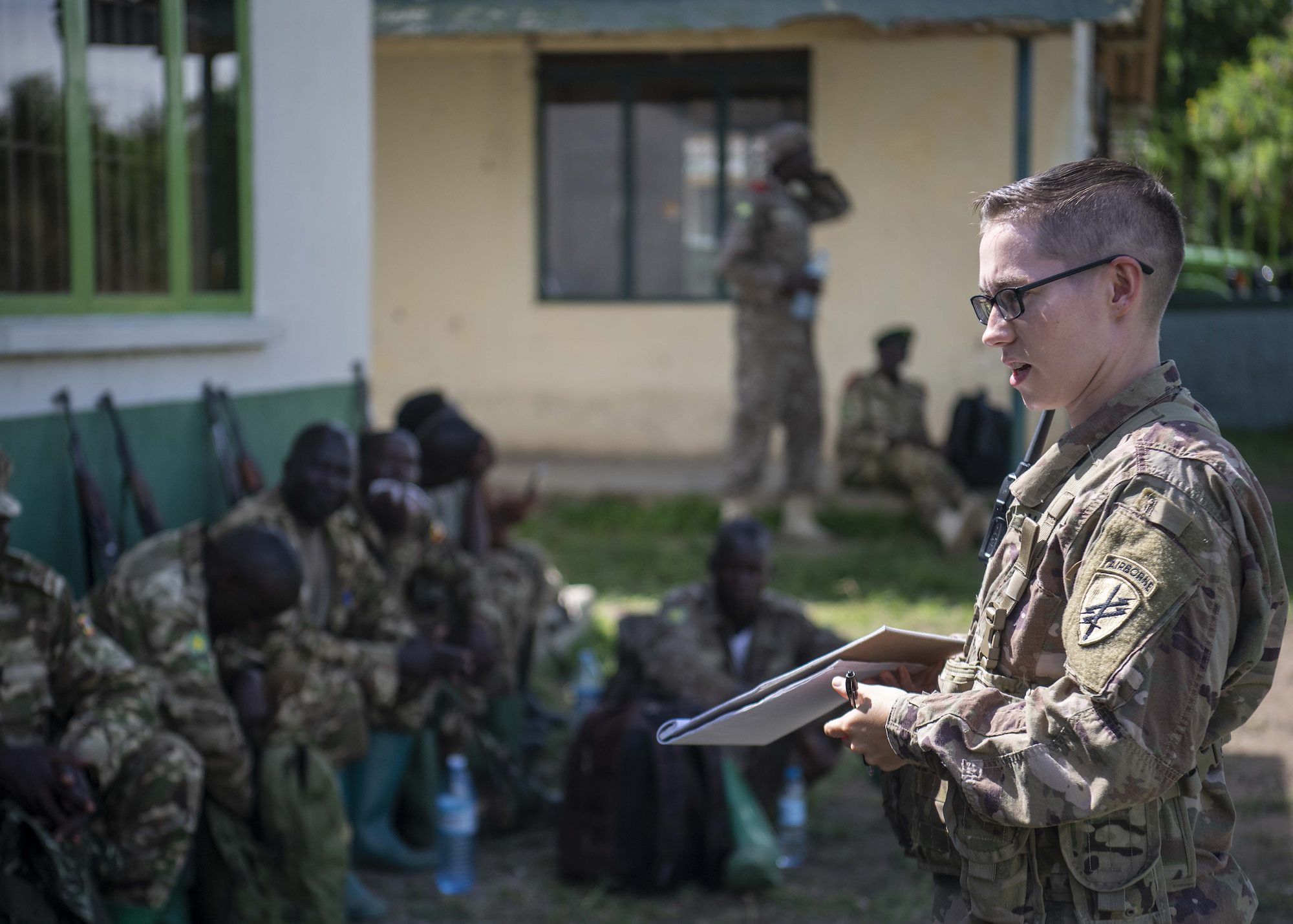 U.S. Army Sgt. Kyri Jones, instructor, 403rd Civil Affairs Battalion assigned to Combined Joint Task Force-Horn of Africa writes a team evaluation during a Counter Illicit Trafficking Junior Leadership Course examination at Queen Elizabeth Park, Uganda, Oct. 10, 2019. Jones was one of six instructors who taught Uganda Wildlife Authority (UWA) Rangers how to conduct land navigation, conduct small unit tactics, respond to wildlife crimes, ethics and medically treat a casualty. (U.S. Air Force photo by Staff Sgt. J.D. Strong II)