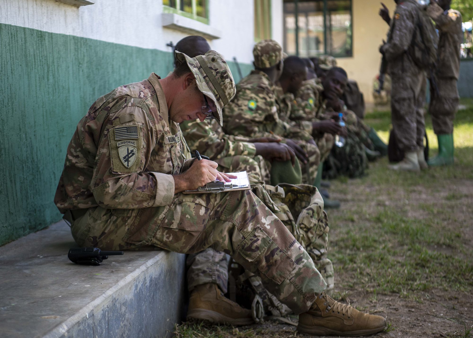 U.S. Army Sgt. Jason Kunkle, instructor, 403rd Civil Affairs Battalion assigned to Combined Joint Task Force-Horn of Africa writes a team evaluation during a Counter Illicit Trafficking Junior Leadership Course examination at Queen Elizabeth Park, Uganda, Oct. 10, 2019. Kunkle was one of six instructors who taught Uganda Wildlife Authority (UWA) Rangers how to conduct land navigation, conduct small unit tactics, respond to wildlife crimes, ethics and medically treat a casualty. (U.S. Air Force photo by Staff Sgt. J.D. Strong II)