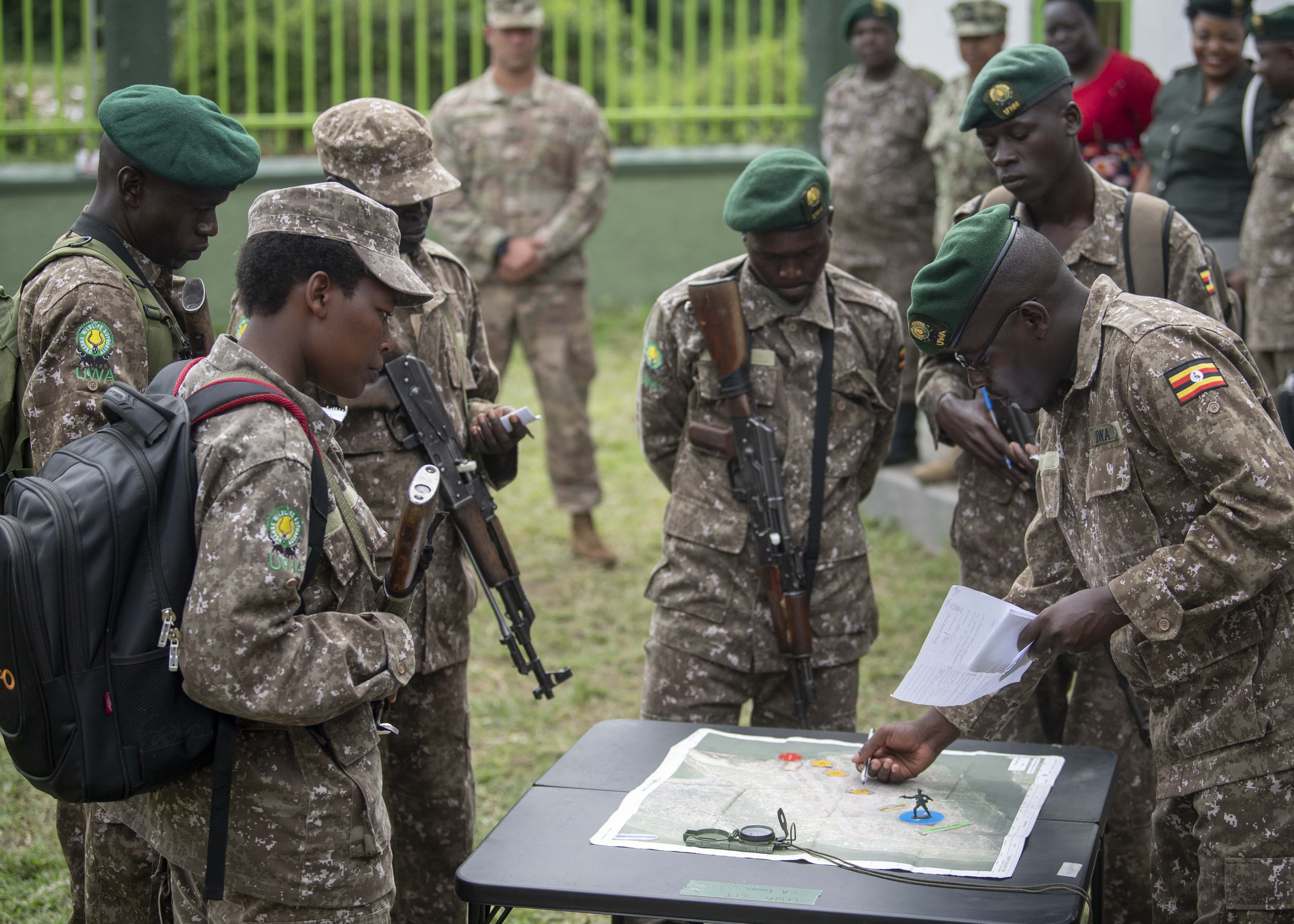 Uganda Wildlife Authority (UWA) Rangers discuss land navigation during a Counter Illicit Trafficking Junior Leadership Course graduation demonstration at Queen Elizabeth Park, Uganda, Oct. 10, 2019. Twenty-five UWA Rangers graduated the course. (U.S. Air Force photo by Staff Sgt. J.D. Strong II)