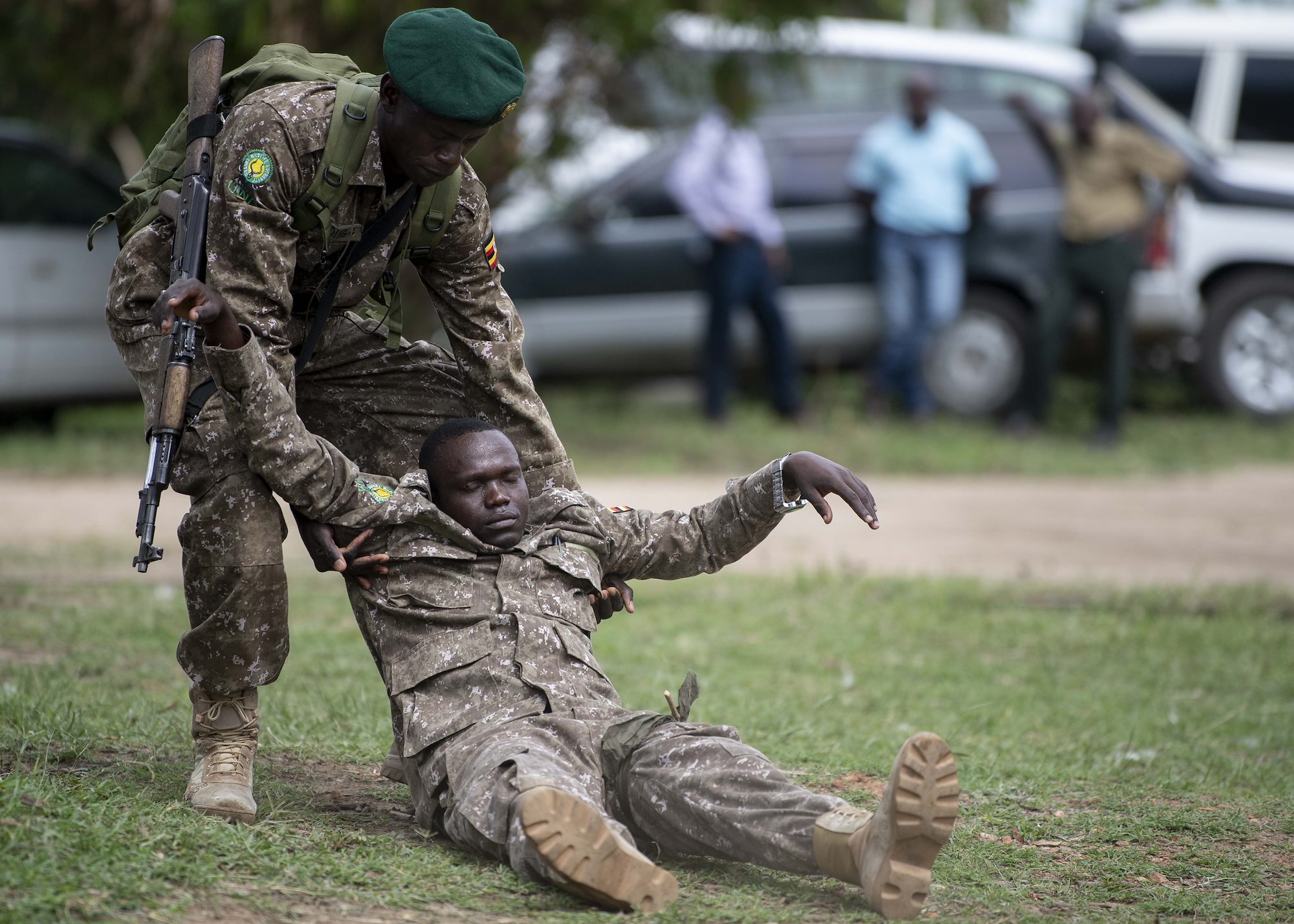 A Uganda Wildlife Authority (UWA) Ranger drags his fellow Ranger from mock danger before performing casualty care during a Counter Illicit Trafficking Junior Leadership Course graduation demonstration at Queen Elizabeth Park, Uganda, Oct. 10, 2019. Twenty-five UWA Rangers graduated the course. (U.S. Air Force photo by Staff Sgt. J.D. Strong II)