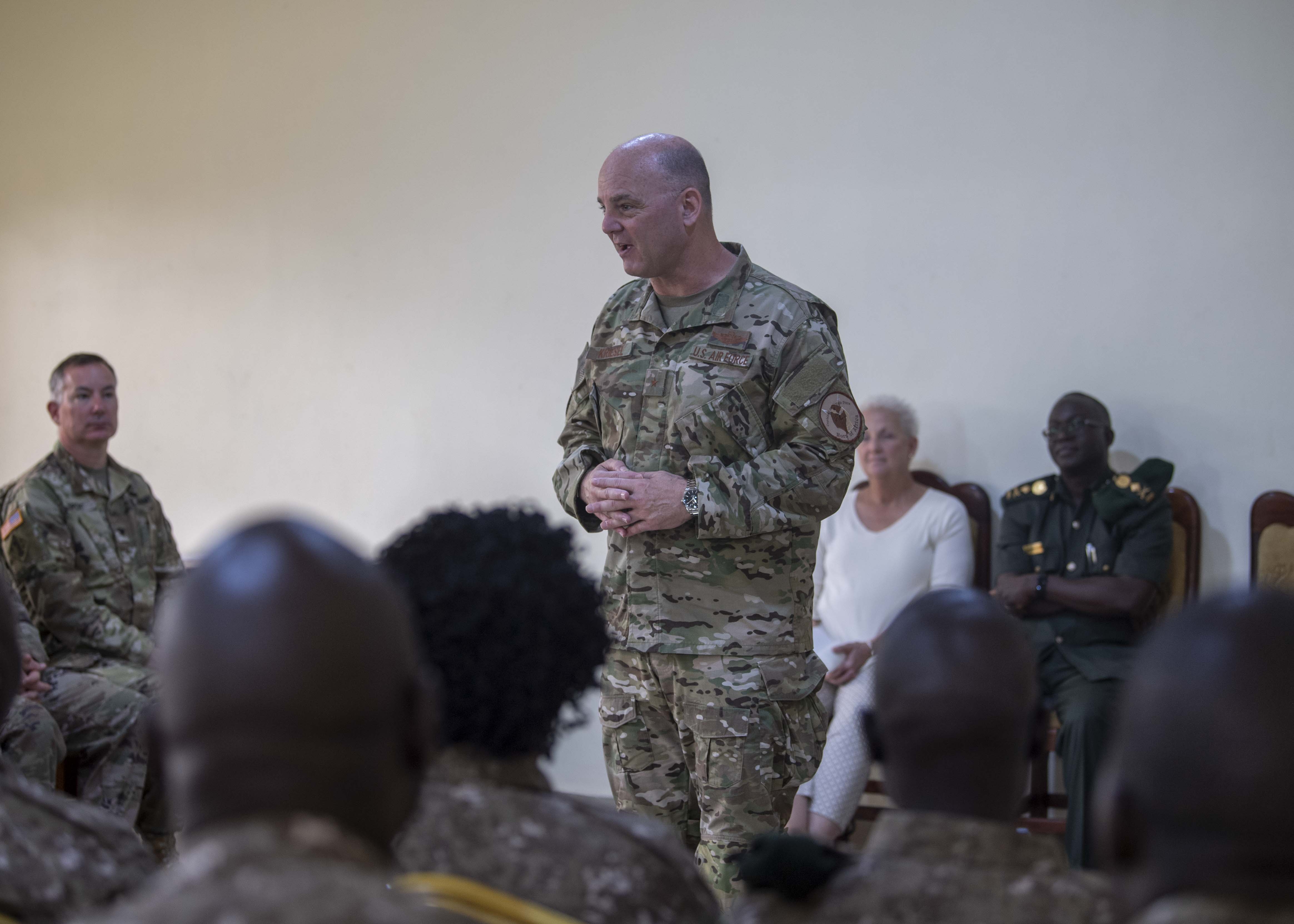 U.S. Air Force Brig. Gen. James R. Kriesel, deputy commanding general of Combined Joint Task Force-Horn of Africa (CJTF-HOA), provides remarks to the Uganda Wildlife Authority (UWA) Ranger graduates during a Counter Illicit Trafficking Junior Leadership Course graduation at Queen Elizabeth Park, Uganda, Oct. 10, 2019. Twenty-five UWA Rangers graduated the course. (U.S. Air Force photo by Staff Sgt. J.D. Strong II)